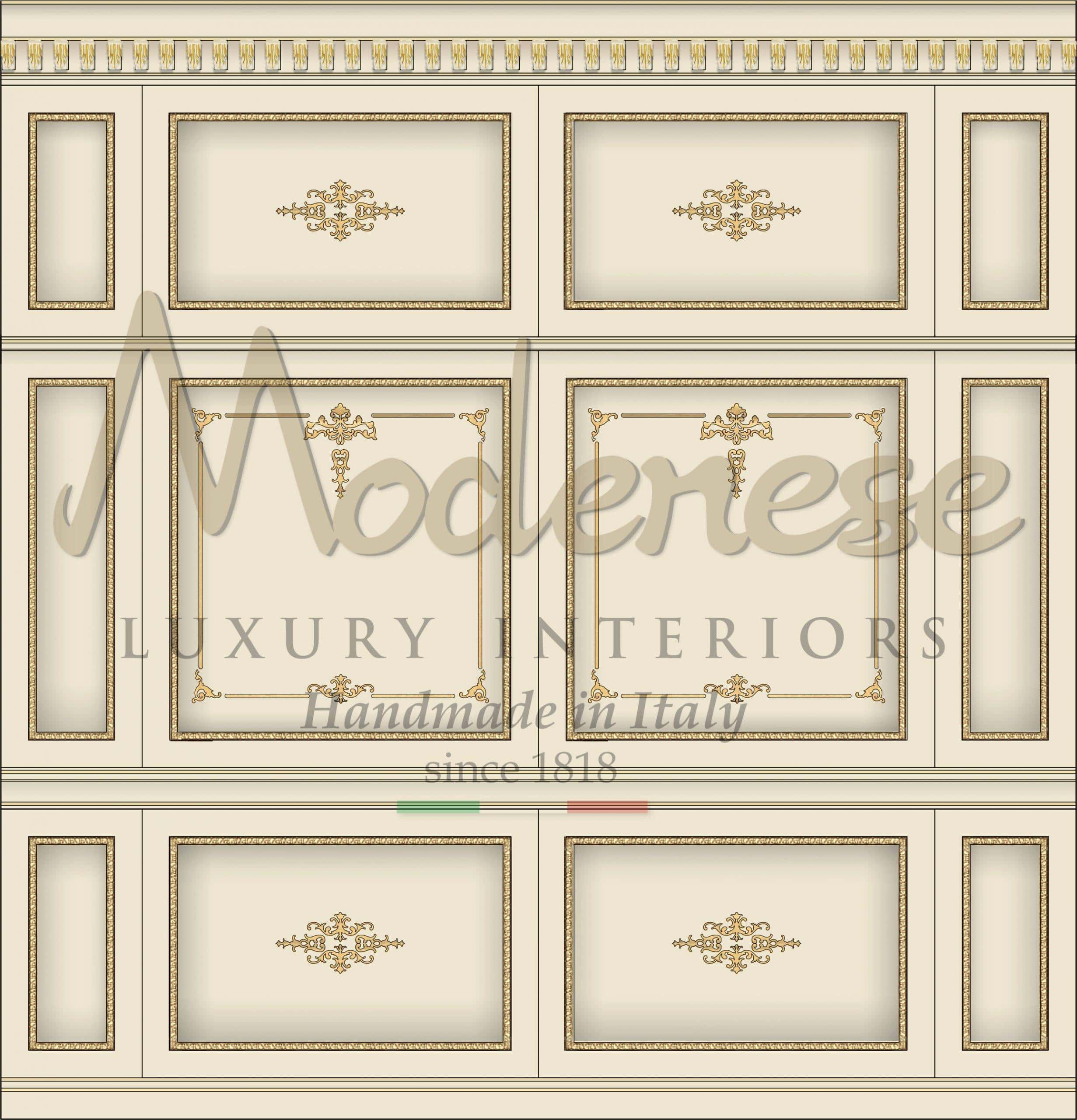 The experience of Modenese professional craftsmen marked by the use of the most precious materials and solid wood are the prerequisites which determine the artisanal manufacturing of made in Italy top quality bosierie. Browse our wall paneling collections and discover the impeccable Italian product guarantee. Various selections of handmade solid wood ornamental ceilings and rich wall paneling complete your luxury furnishing project.