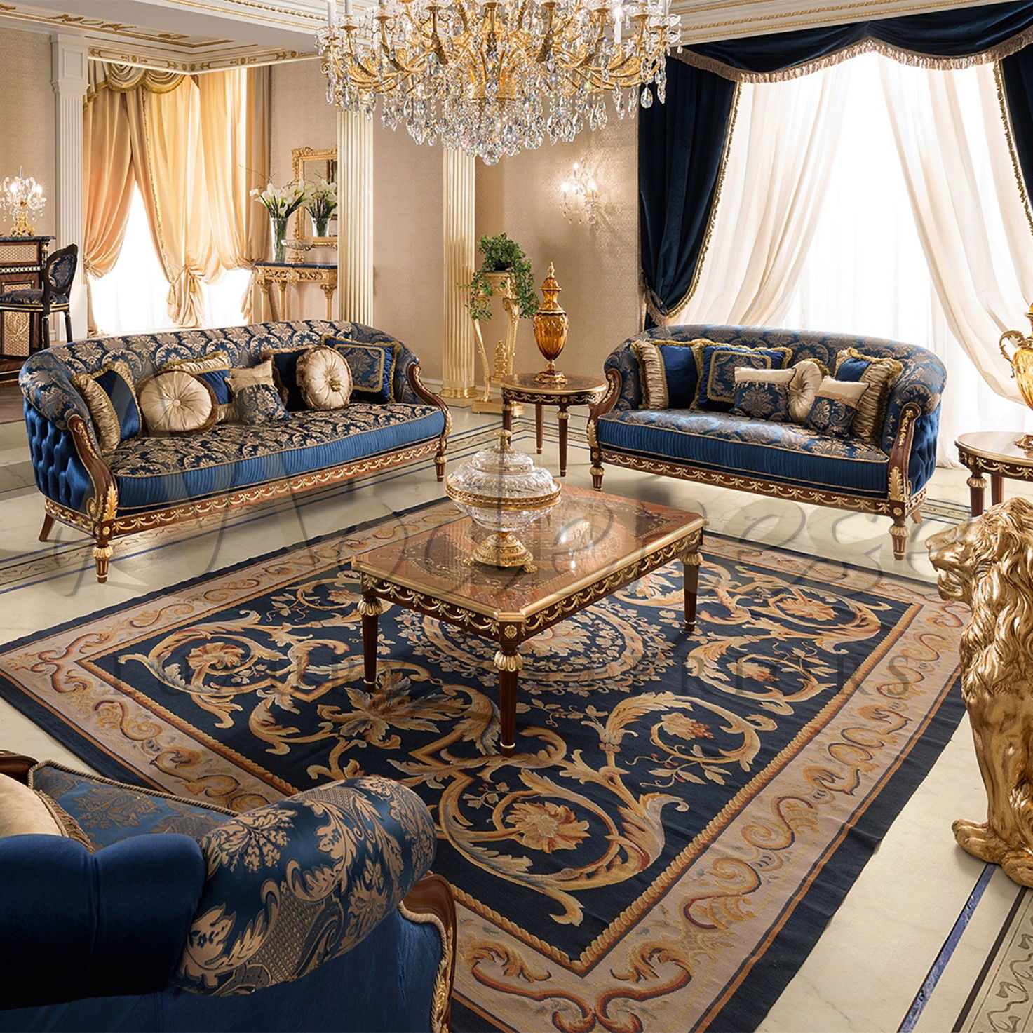 تم تقسيم منطقة المعيشة الكبيرة إلى ثلاثة مناطق من قبل المصممين. غرفة المعيشة، التي ترتفع على قاعدة منخفضة، تقع مباشرة على اليمين من المدخل ومفروشة بأثاث إيطالي فاخر. يستخدم المصممون عناصر ديكور مثل عمود أنيق بديكور جص ذهبي لتوحيد هندسة الفضاء. يضفي الديكور الرائع للعمود بالكريستال والترصيعات الذهبية على الغرفة وقارًا بالإضافة إلى أناقة أنيقة.