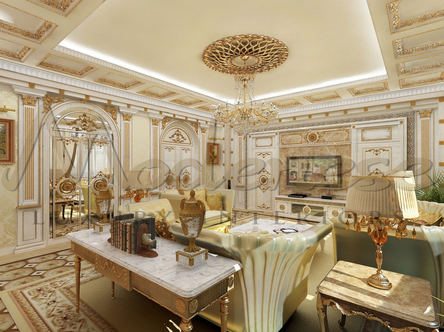 كانت لمسات الآرت ديكو في غرفة المعيشة عبارة عن لوحة مرآة ذات وجه، والتي وسعت بصريًا المساحة، مضيفة إلى الديكور الداخلي مزاجًا مبهجًا وألوانًا زاهية. لقد تحول التصميم الداخلي الفاخر للشقة في لندن إلى تصميم أنيق ورائع بمظهر فريد من الفخامة بروح العصر الحديث. وقد تجاوزت النتيجة جميع توقعاتها وأصبح الديكور الداخلي تجسيدًا رائعًا لحلم جزيرة مريحة وفاخرة خاصة بها وسط المدينة الصاخبة.