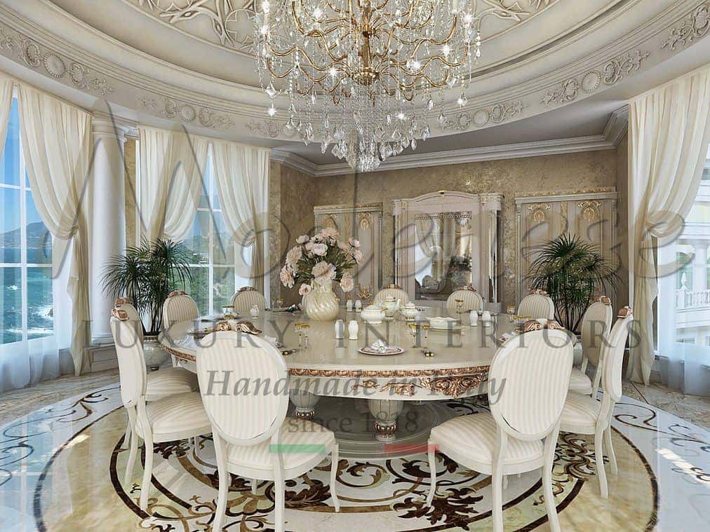 غرفة طعام فيلا ملكية مع كراسي منحوتة يدويًا متطورة. كل شيء متطابق تمامًا مع زخارف خشبية صلبة أنيقة مصنوعة يدويًا لخلق جو ساحر سيتميز بمشروع الأثاث الحصري لمنزلك.