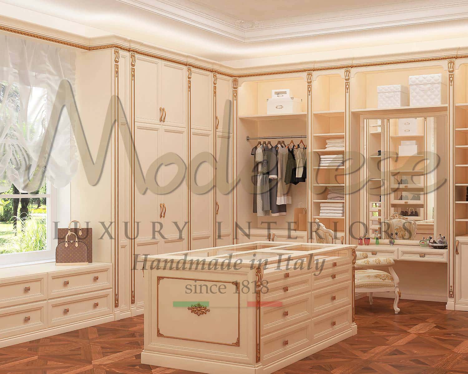 خزائن ملابس مخصصة ملكية تتميز بتصميم وجودة إيطالية حصرية. سيقوم فريق التصميم الداخلي لدينا بإنشاء خزانة ملابس مخصصة لك مع إضافات زخرفية فاخرة مثل تفاصيل الذهب والنحاس. زين ركنك الخاص بأفضل تصميم كلاسيكي للحرفية الإيطالية التقليدية. منتجات خالدة مصممة وفقًا لأفكار عملائنا.