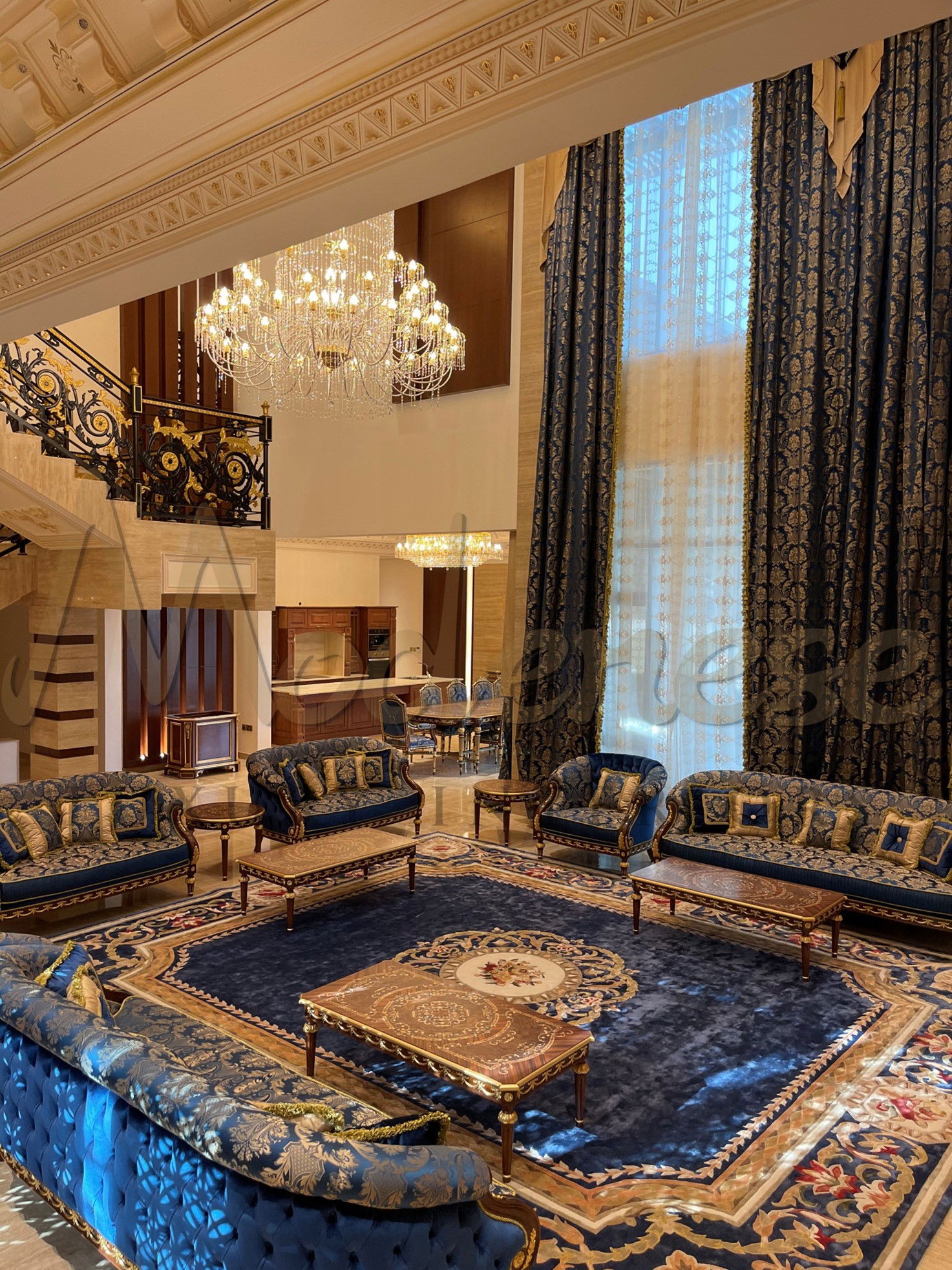 La palette de couleurs pastel domine la conception intérieure de ce salon. Le plafond est recouvert de stuc et d'accents dorés dans les plus grandes traditions du style classique. Les rideaux et les coussins dans des tons violets chauds ont créé de charmants points forts sur un thème crème-beige.