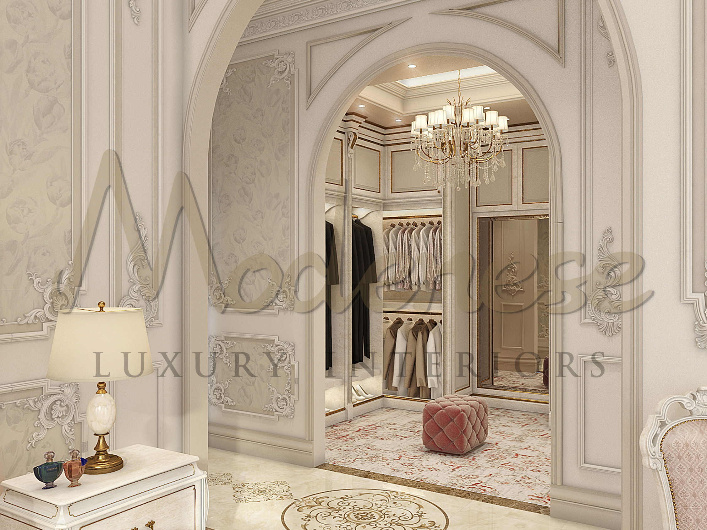 Bien que la maison soit là où se trouve le cœur, la chambre à coucher est là où se trouve l'âme. La chambre à coucher est votre havre de paix, l'endroit où vous pouvez vous détendre après une longue journée. Il n'est pas étonnant que nous prenions autant de temps à décider du design idéal de la chambre à coucher. Chez Modenese Luxury Interiors, il existe de nombreuses options de design de chambre à coucher parmi lesquelles choisir. Chaque personne est unique, tout comme ses besoins de rangement. Ce design de chambre à coucher présente des étagères ouvertes et fermées dans les armoires et des tiroirs de rangement. Vous pouvez non seulement ranger vos vêtements, mais aussi exposer vos souvenirs et vos objets de collection.