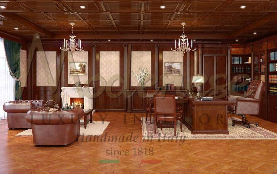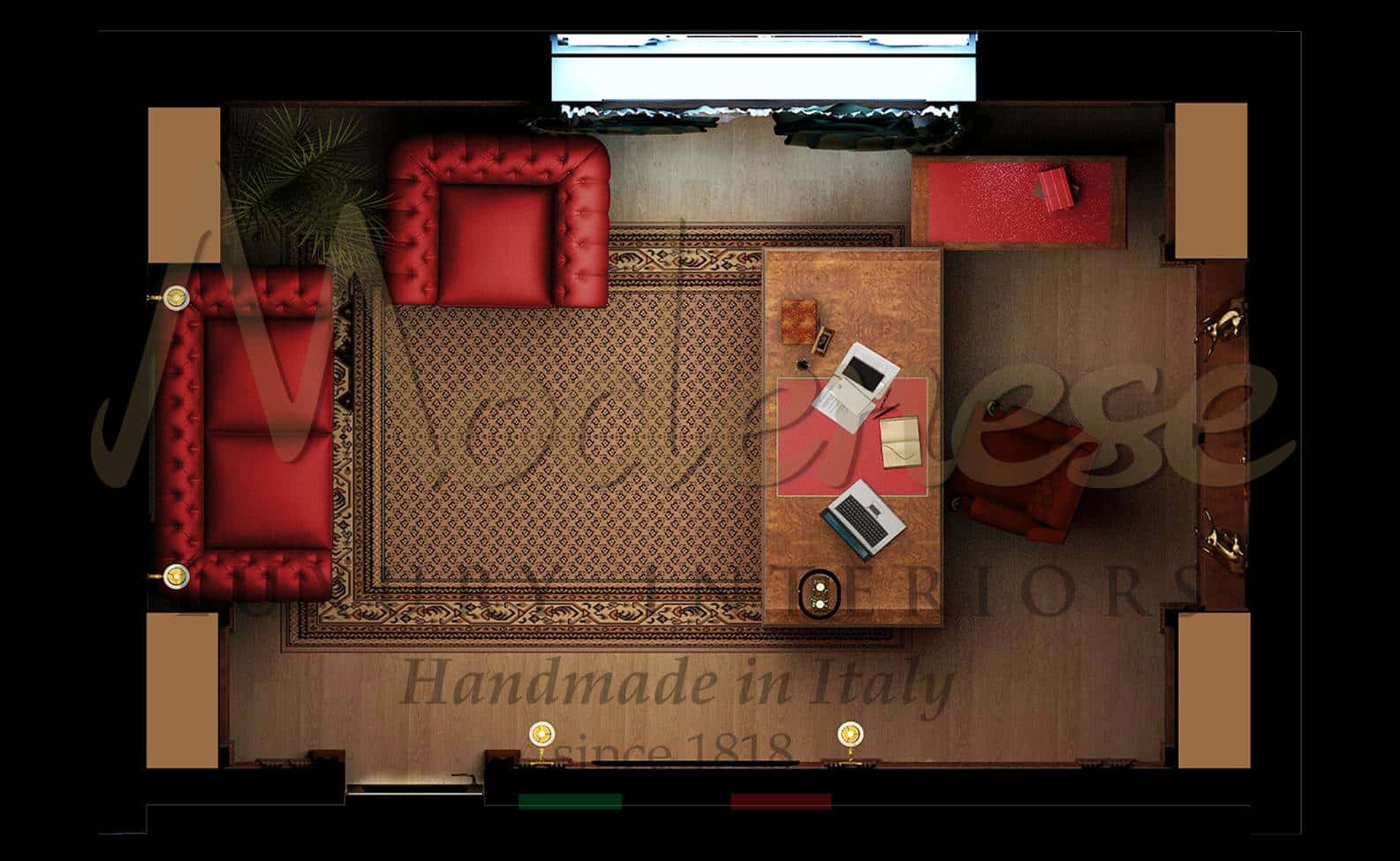 Notre service de conception d'intérieur vous proposera les meilleures options pour un aménagement et un mobilier classiques personnalisés pour des projets de luxe uniques. Nos conceptions et notre production sur mesure vous donnent la possibilité d'enrichir votre projet de différents styles classiques afin de rendre votre bureau privé unique. Production de haute qualité entièrement fabriquée en Italie pour ressentir le pur style de vie luxueux.