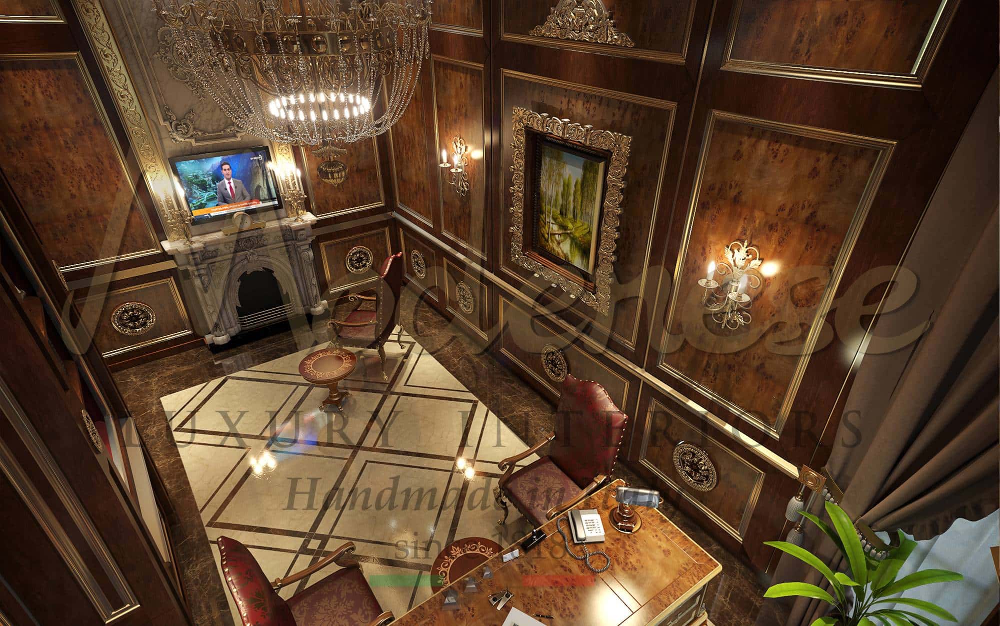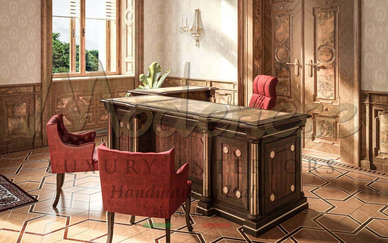 Modenese Luxury Interiors service de conception pour vos bureaux privés : les meilleures solutions de décoration de bureau luxueuse et élégante. Style classique et raffiné d'un design italien exclusif pour des projets de mobilier et d'aménagement avec une qualité haut de gamme et des matériaux précieux tels que l'or, le marbre, le cuir, la nacre, le tout personnalisé pour votre projet spécial et unique.