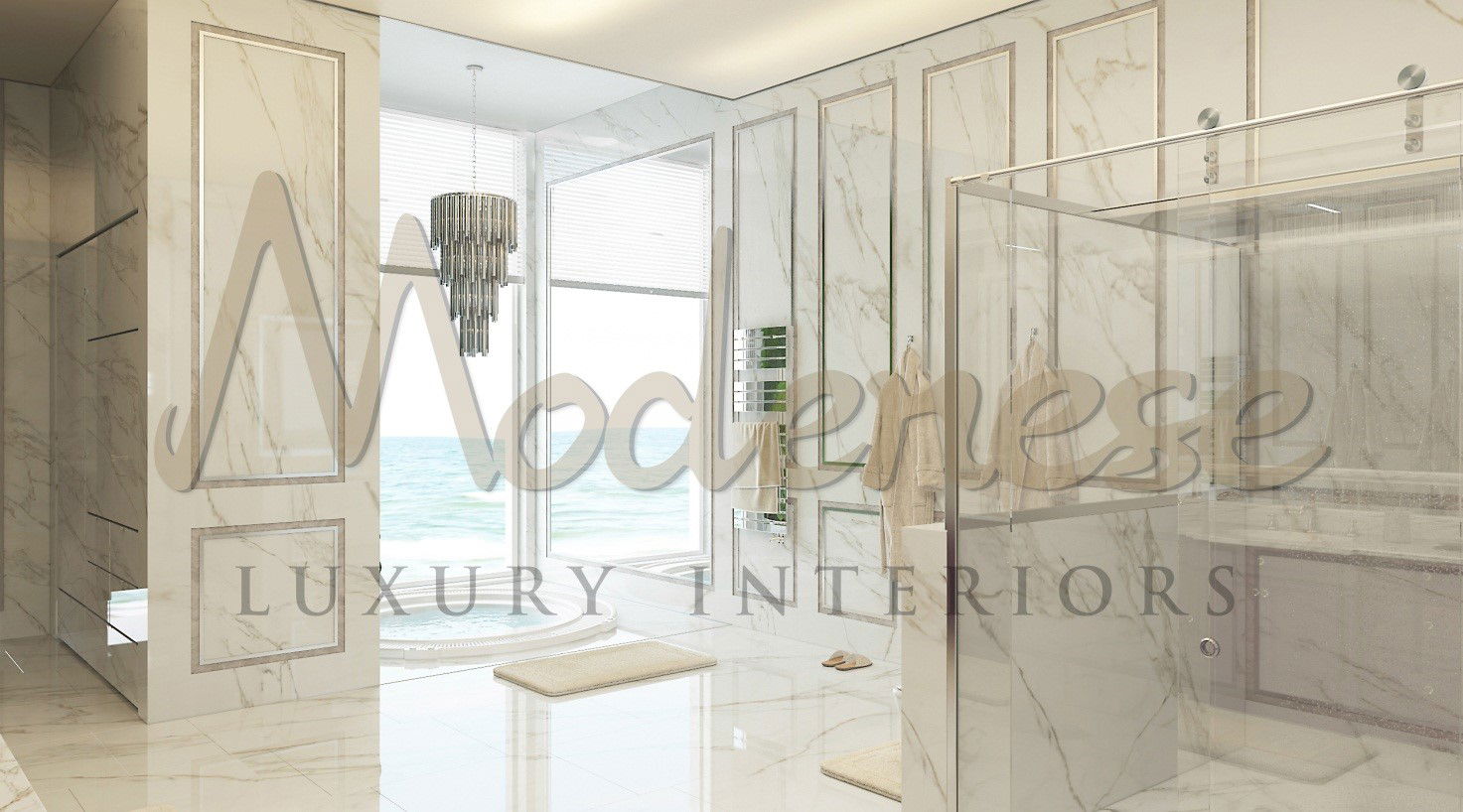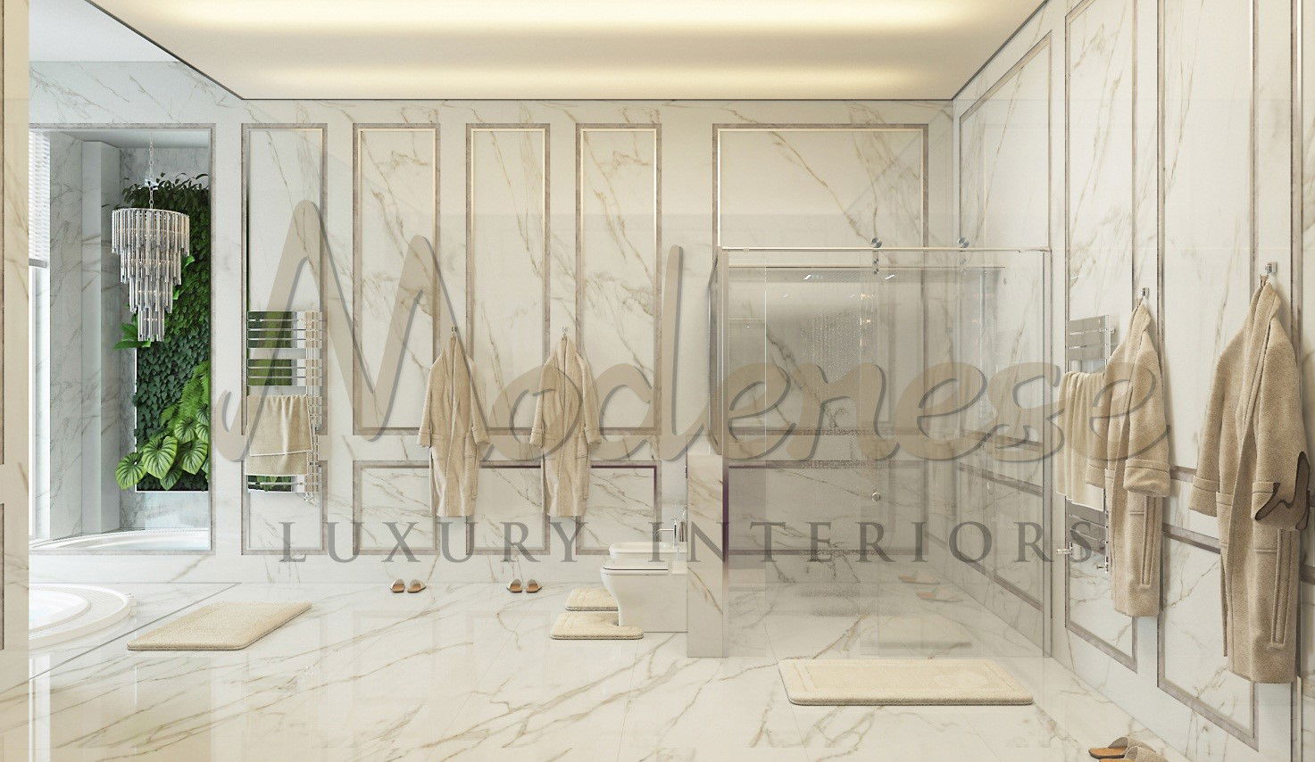 Pour préserver la direction stylistique et accentuer le statut de l'intérieur, les conceptions de salles de bain à Dubaï doivent être en harmonie avec l'idée générale de la conception intérieure. Exactement la même stratégie est utilisée dans le travail de conception d'intérieurs de première classe. Les conceptions de salles de bain simples avec toutes les chances que nous offrent les dernières technologies sont incluses dans la conception de maisons et d'appartements de luxe. Chaque mètre carré de luxe procure confort et plaisir esthétique. La conception de salle de bain de style traditionnel peut être aussi somptueuse et luxueuse que le reste de la maison. Même un petit espace de salle de bain peut être conçu de manière à ce que le décor soit adapté à l'ambiance sobre et procure des sensations extrêmement agréables à tout moment de la journée.