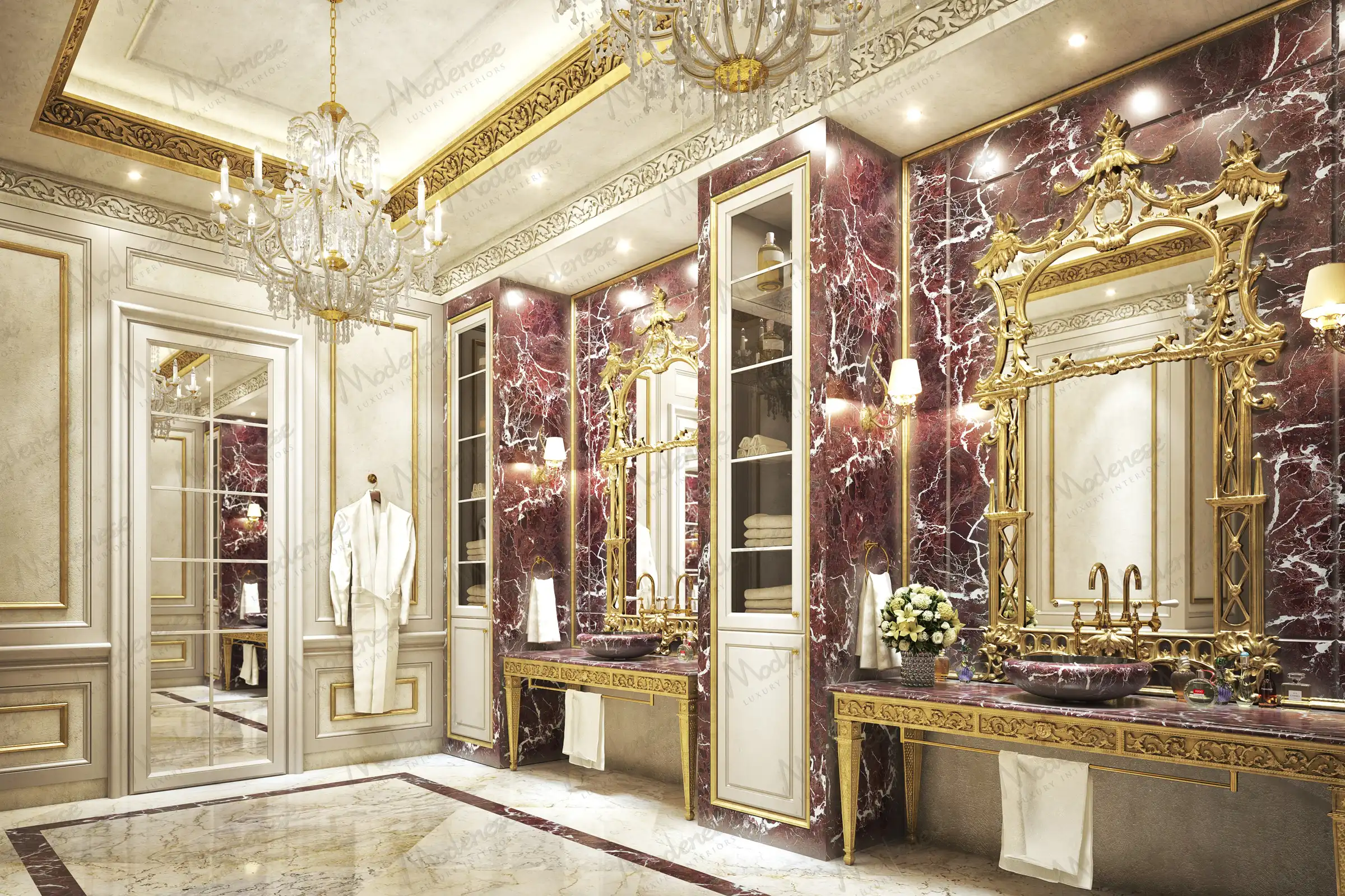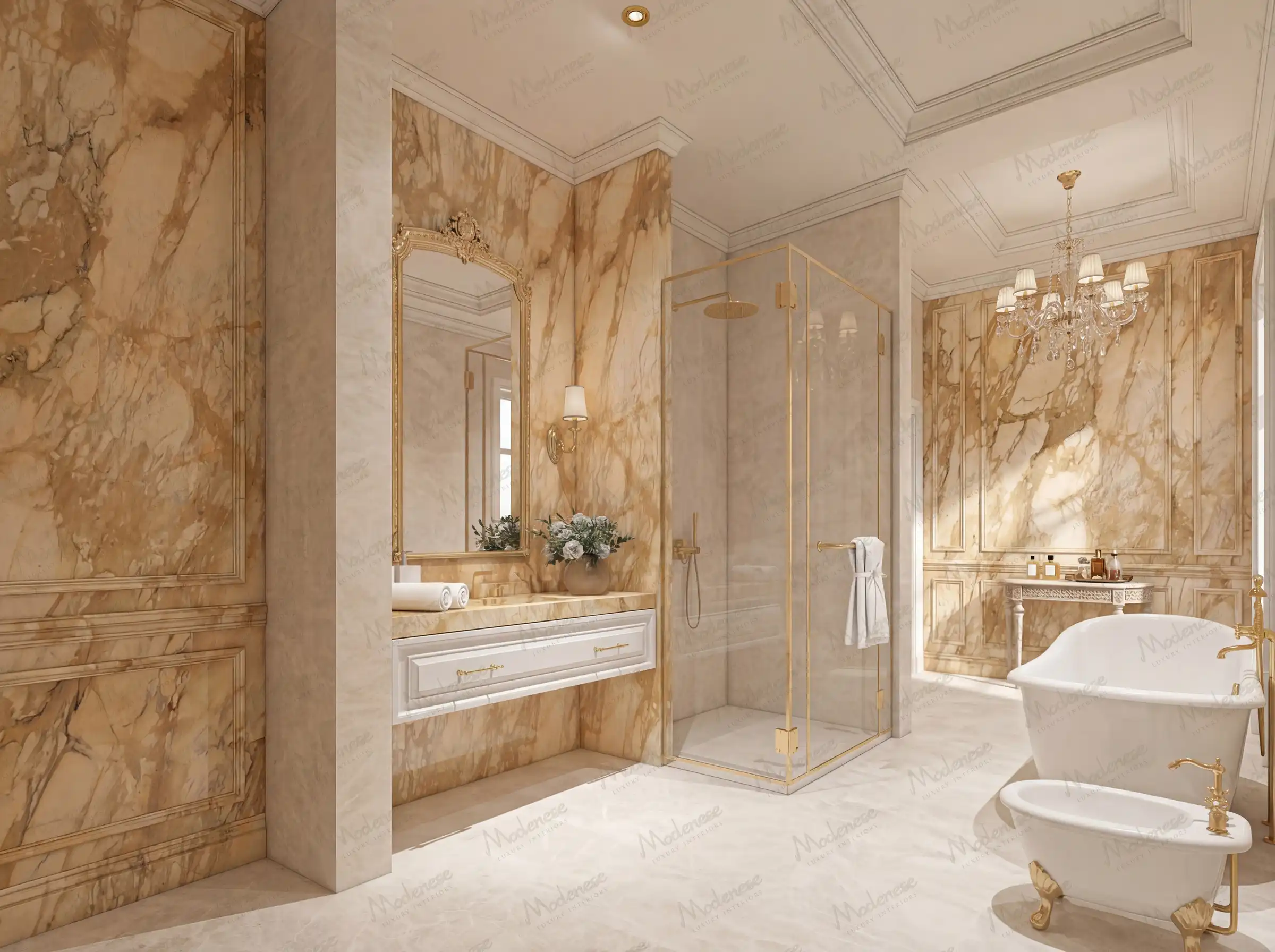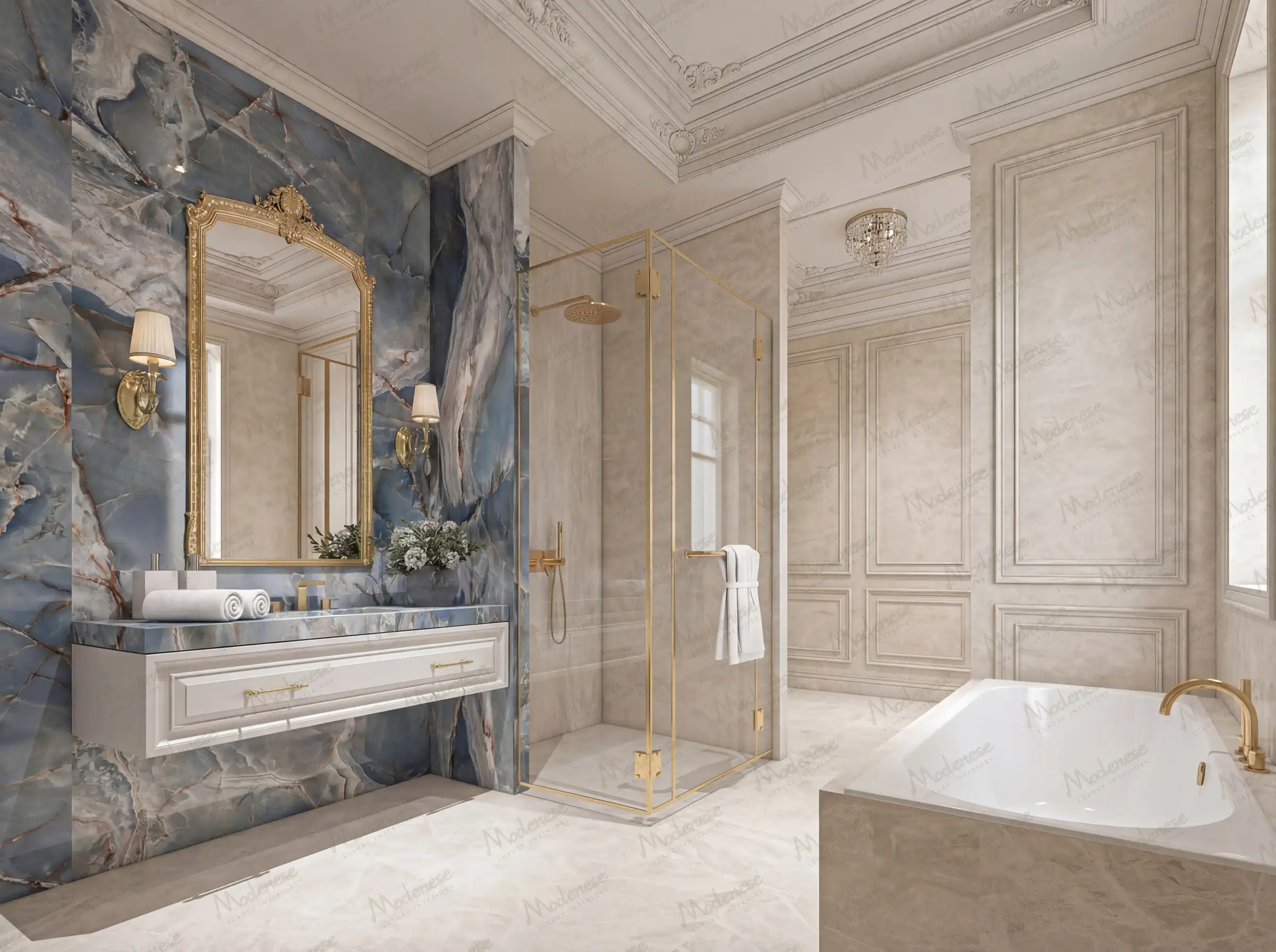 Every bathroom design by Modenese Luxury Interiors is characterized by an extraordinary attention to detail. From the selection of premium materials and bespoke finishes to the precise placement of fixtures and accessories, no aspect is overlooked. This meticulous approach ensures that each bathroom not only meets the highest standards of quality and functionality but also exudes an air of refined elegance and sophistication.
