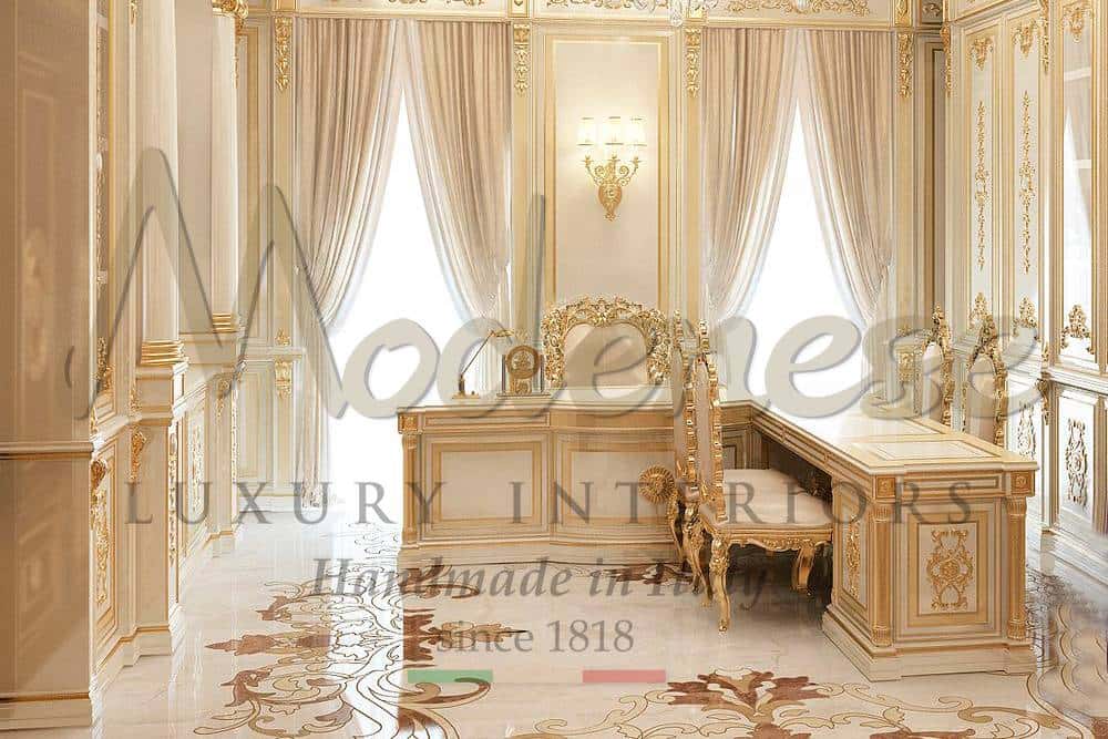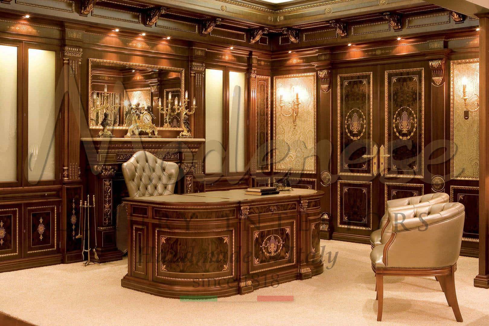 Величественный проект исполнительного офиса с классической мебелью для уникальных и роскошных пространств. Наша команда дизайнеров интерьера предоставит вам лучшие варианты для вашего проекта исполнительного офиса с эксклюзивными и уникальными идеями. Оснащение и изготовление мебели с высоким качеством и уникальным итальянским дизайном для королевских офисных проектов.
