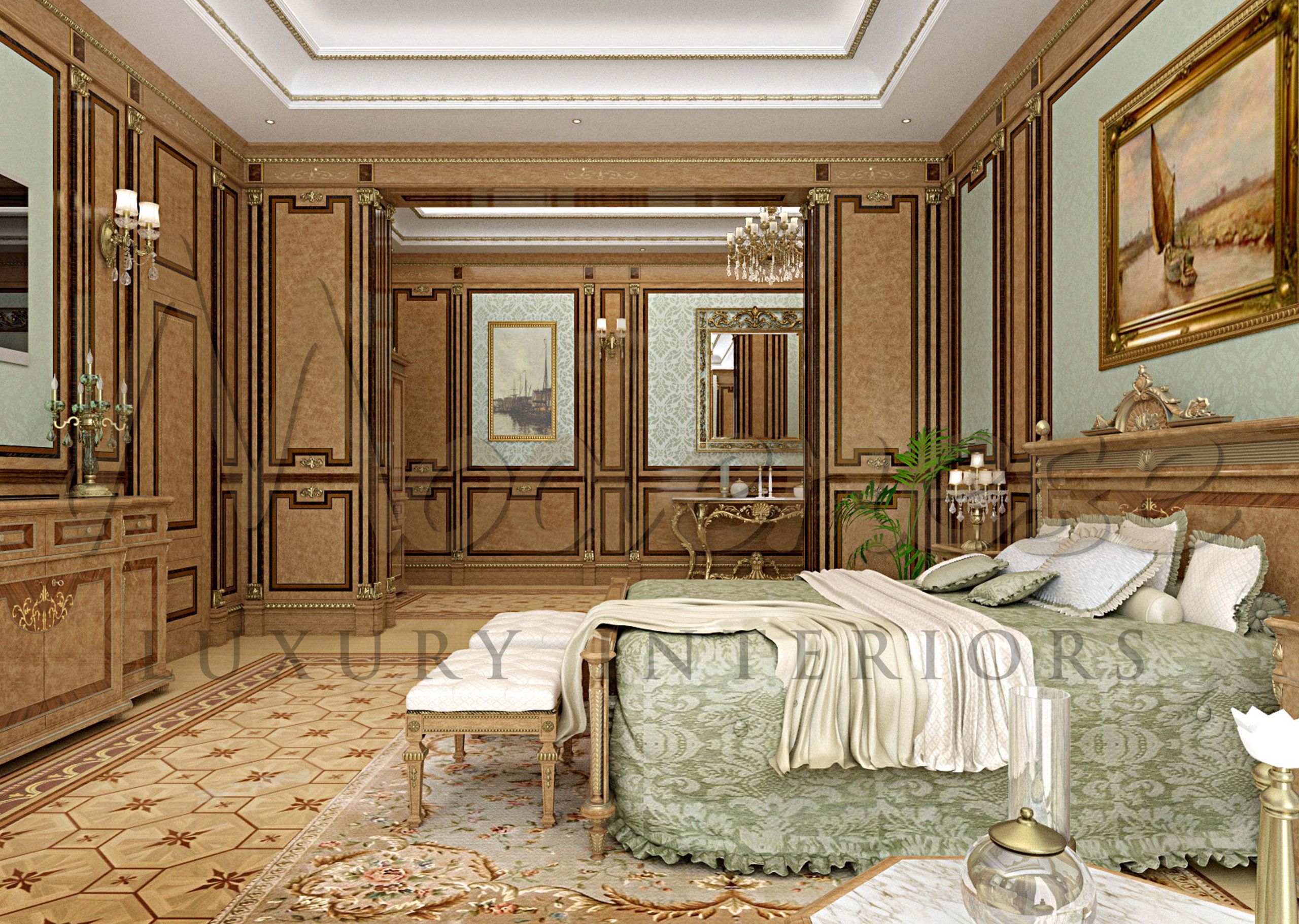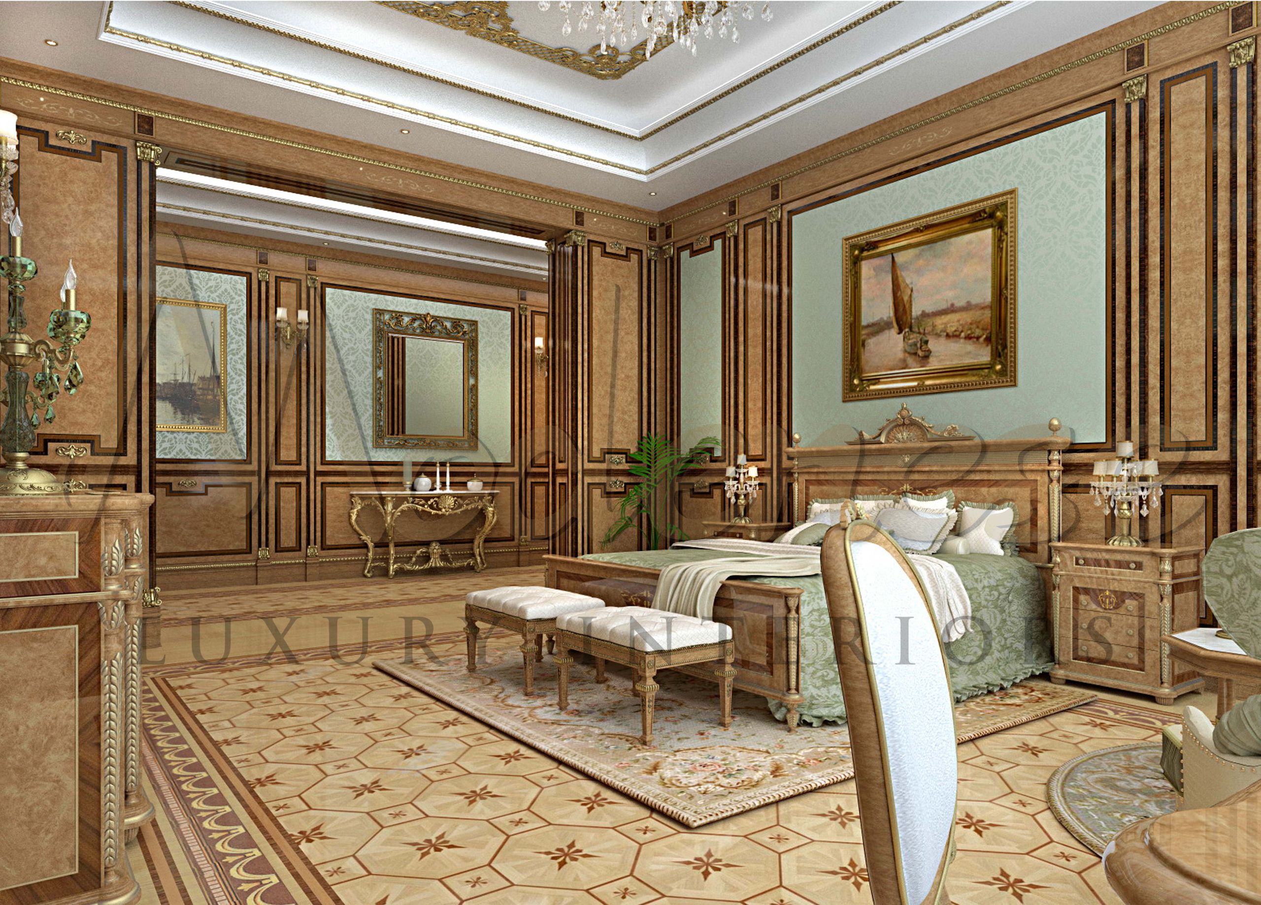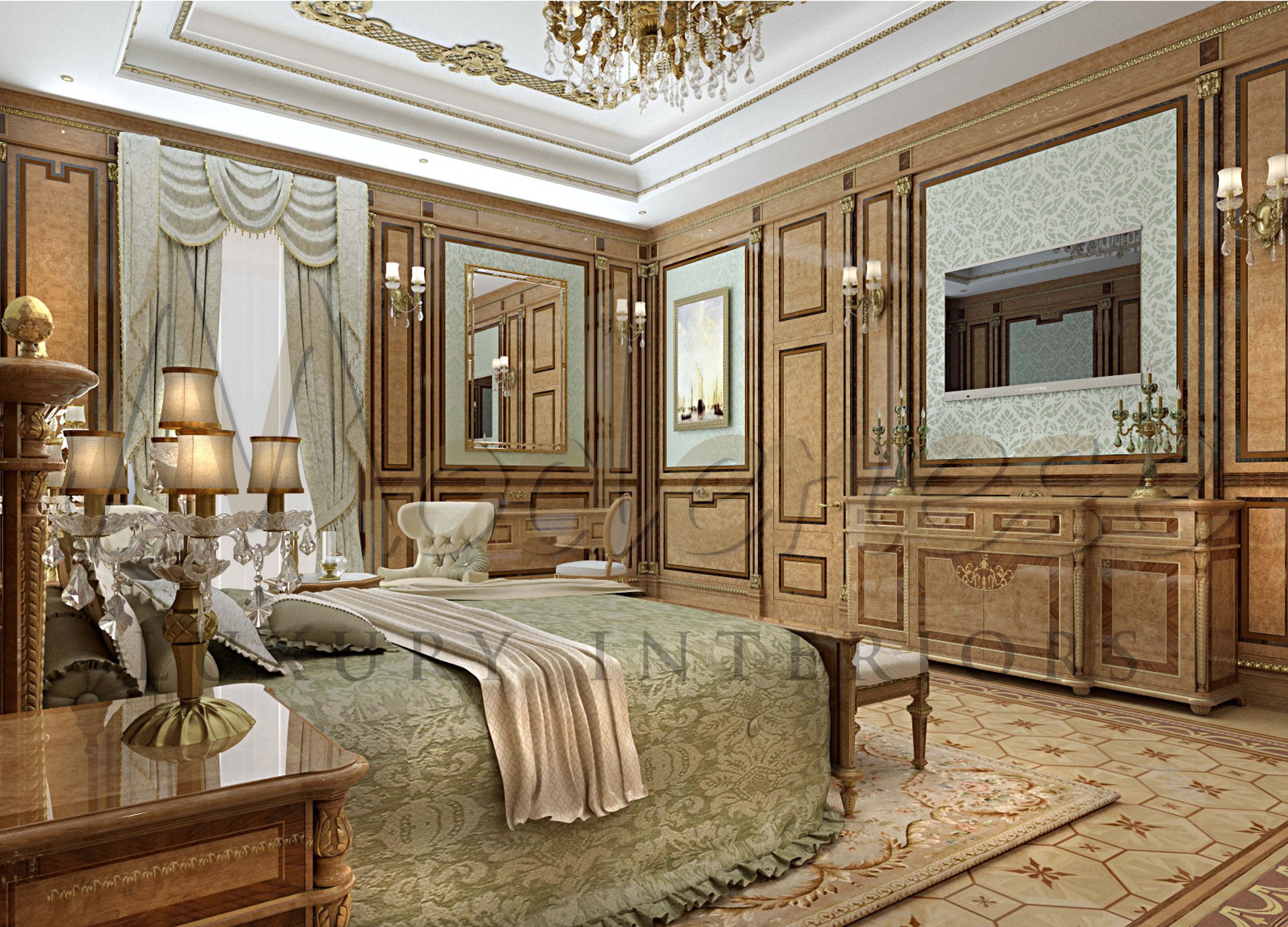 Классический стиль спальной мебели с изготовленными на заказ деревянными панелями обогащает этот элегантный королевский проект: полностью разработанный и тщательно созданный нашими архитекторами, чтобы достичь высокой оценки стен и преобразить внешний вид комнаты, подчеркнув ее уникальное очарование.