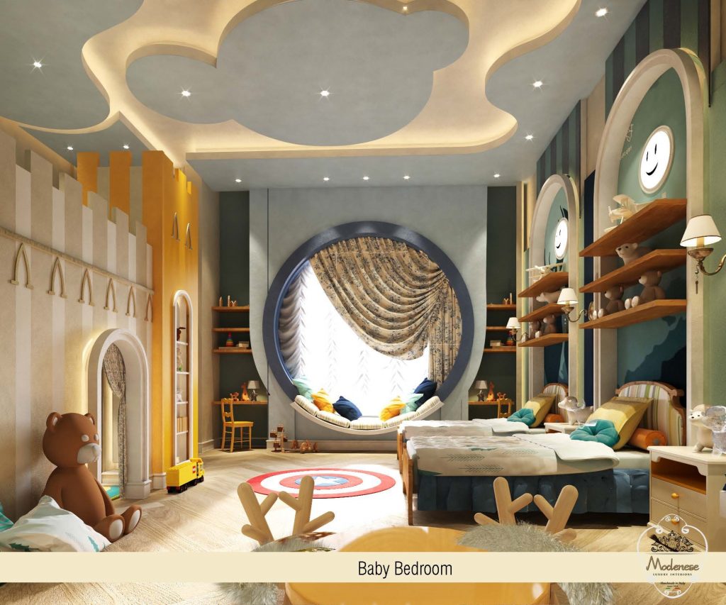 在这个例子中,两张儿童床是 interiors 设计中无可争议的领导者。用图案丰富的纺织品软包的床头板与雕刻装饰元素相得益彰。