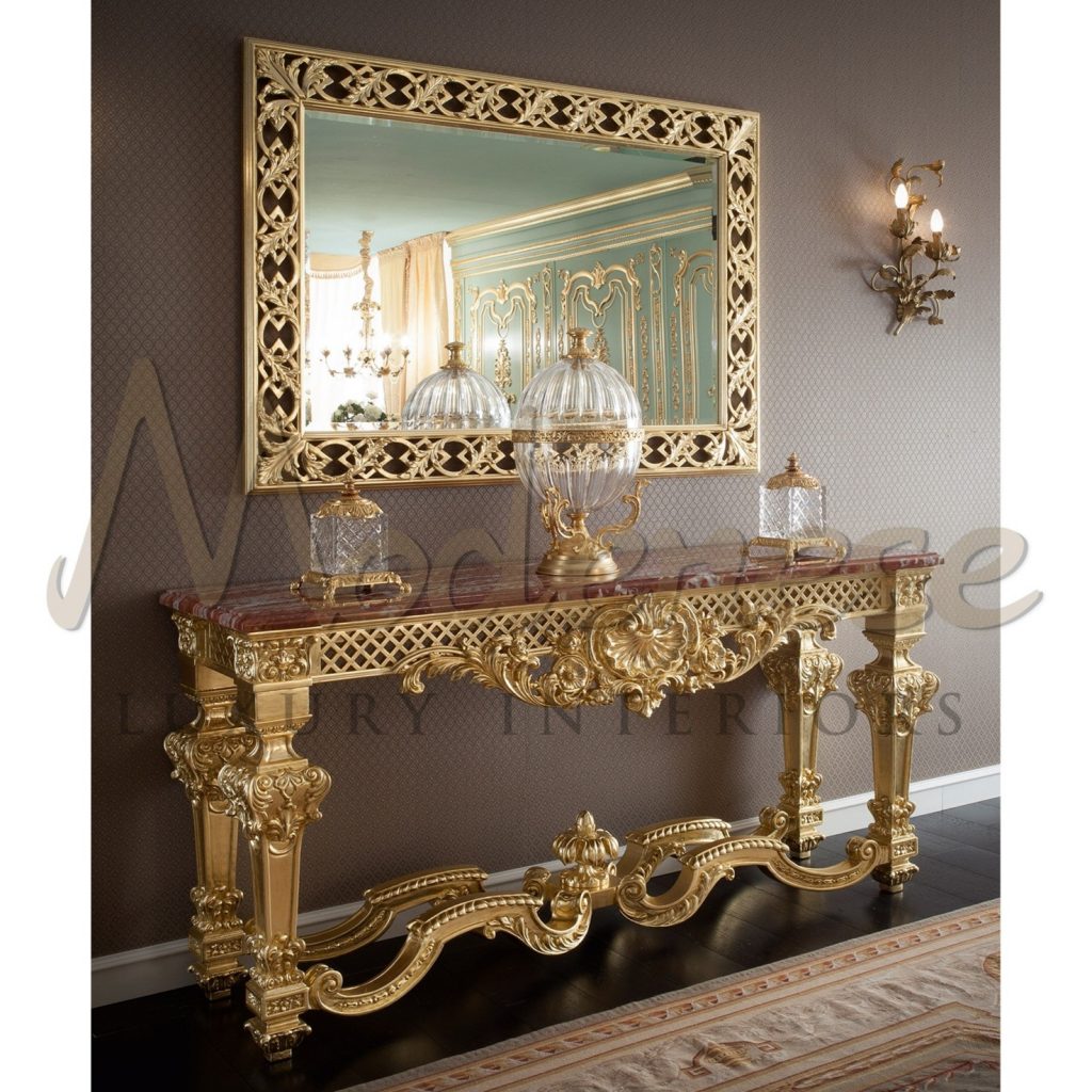 镜子在 interiors 中扮演着特殊的角色。它在视觉上扩大了空间,使其更明亮、更通用。如果镜子装饰着美丽的雕刻框架和镀金,那么这样的物体将为 interiors 增添光泽和皇家奢华。古典风格的 interiors,特别是大厅,通常采用镜子和控制台的组合。这个例子的亮点是用天然缟玛瑙制成的台面。