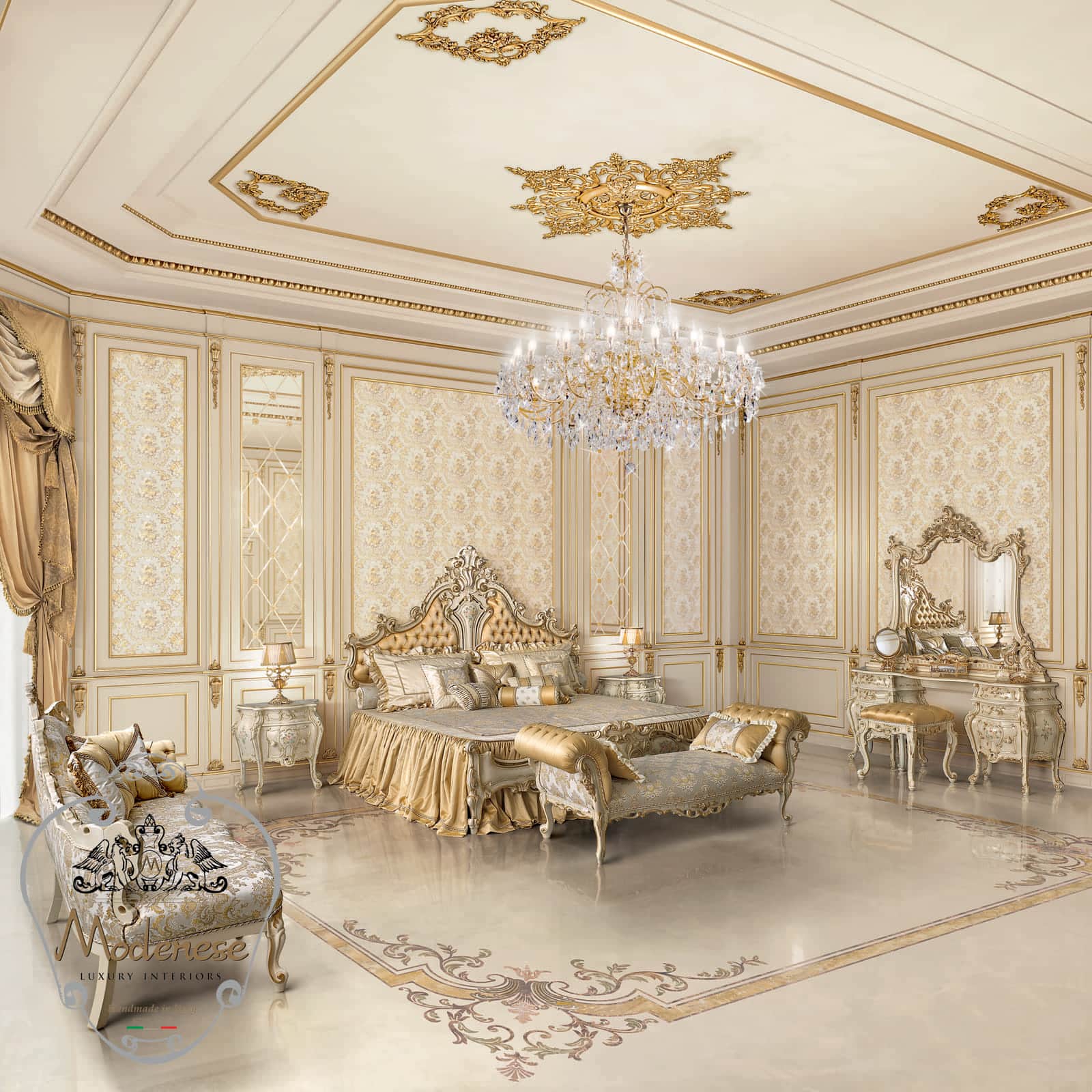 由手工打造的皇家卧室。衣柜、床头柜和卧室椅子都为您的房间增添了风采,同时也提供了储物和舒适性。这款金色卧室家具制作精美,经久耐用。