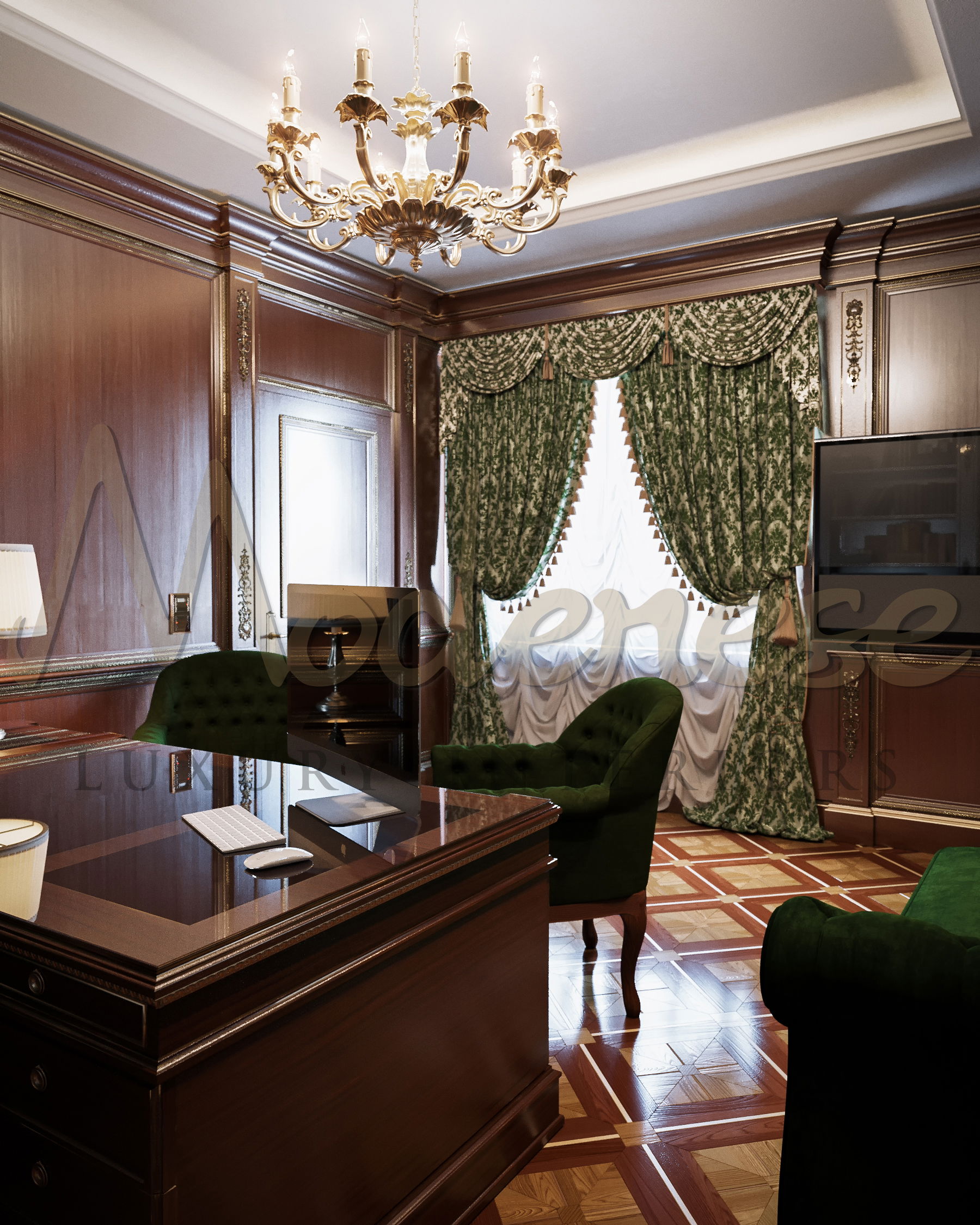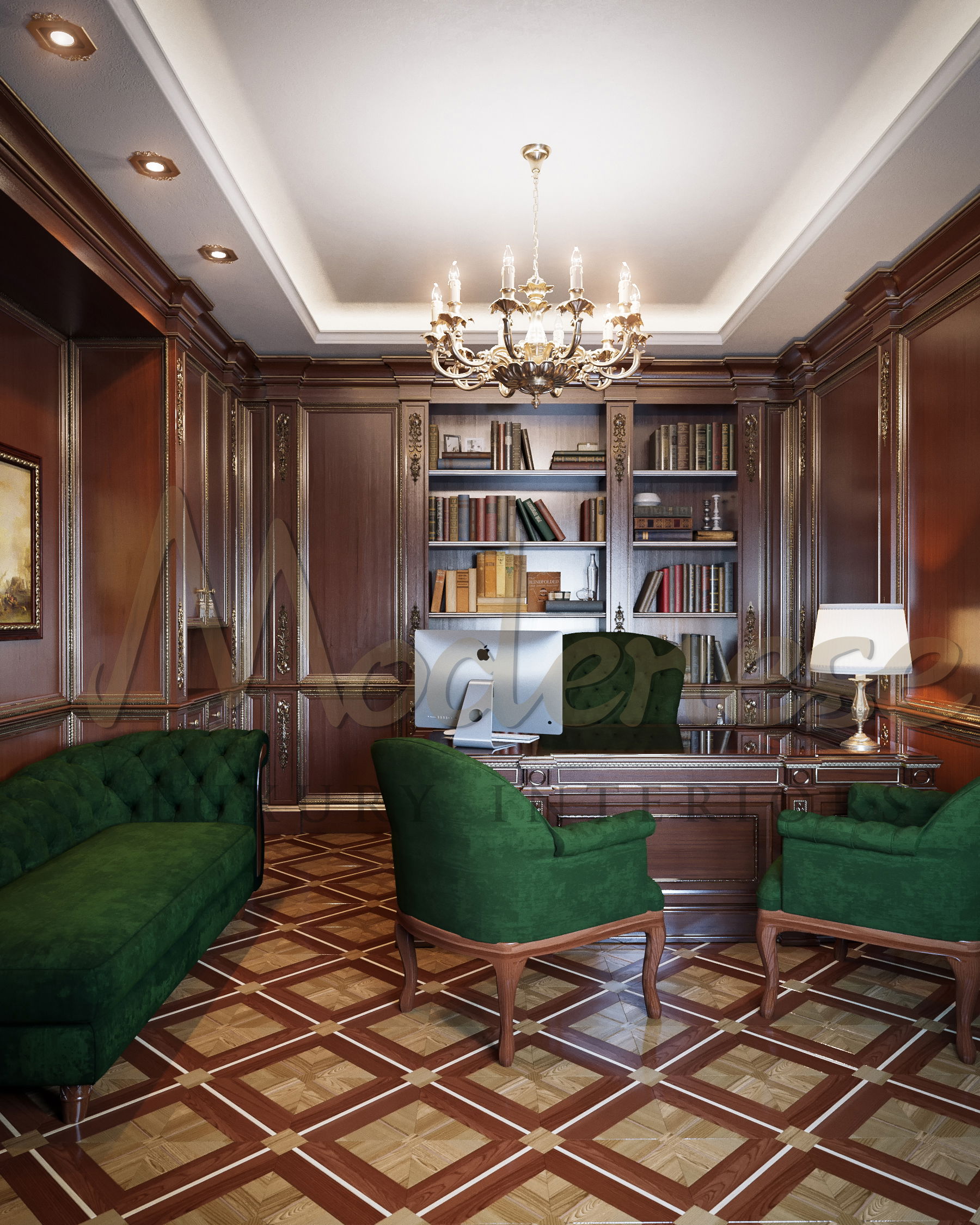 这个办公室内部空间是为尼日利亚豪华住宅的尊贵业主创建的。客户将该项目委托给 Modenese Luxury Interiors 的著名设计师。这是一个非常有趣的项目,因为它需要独特的方法和对细节的关注。重要的是要强调房主的尊严和体面。访客主要钦佩办公室内部空间的尊严和体面。为了在办公室创造舒适的氛围,为该项目选择了经典风格。尼日利亚办公室的设计强调了 Modenese Luxury Interiors 卓越的服务质量。