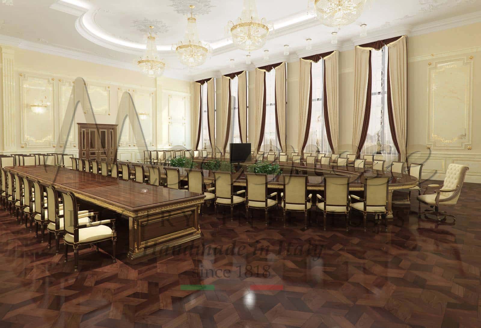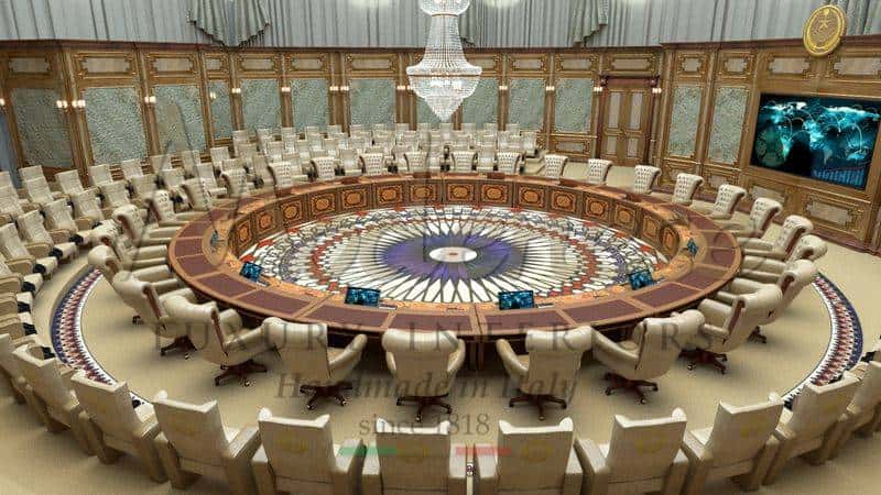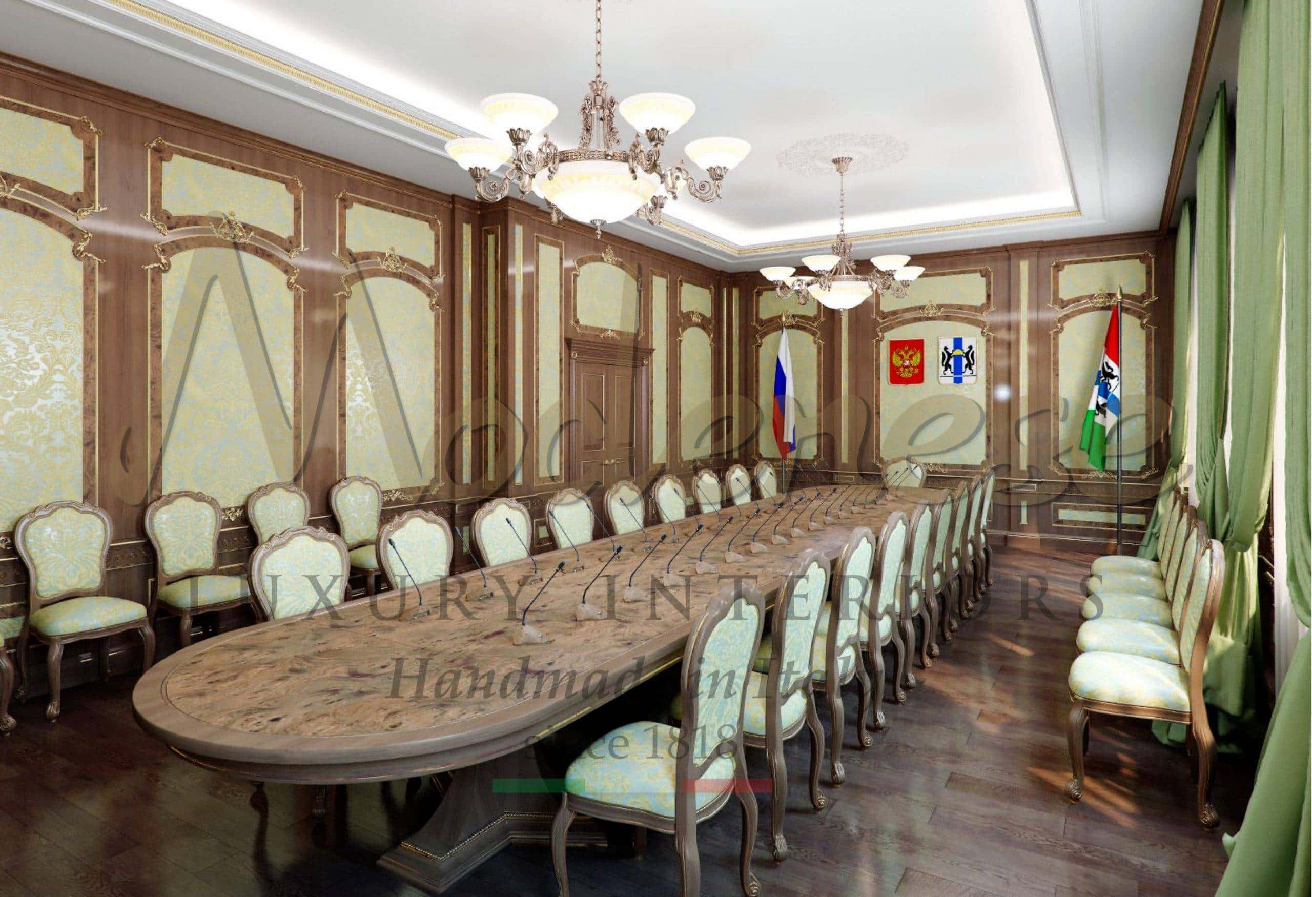 Modenese Luxury Interiors 政府办公室项目家具设计包括为世界各地使馆、总统办公室和专属行政办公室家具创意提供的顶级选择。由我们专业的团队设计并由我们熟练的工匠 100% 在意大利手工制作的古典和豪华家具。定制的会议桌、书桌、沙发和扶手椅,为您的精致政府家具项目创造最佳的品质和设计。我们的室内设计服务将为优雅的政府环境创造皇家空间。