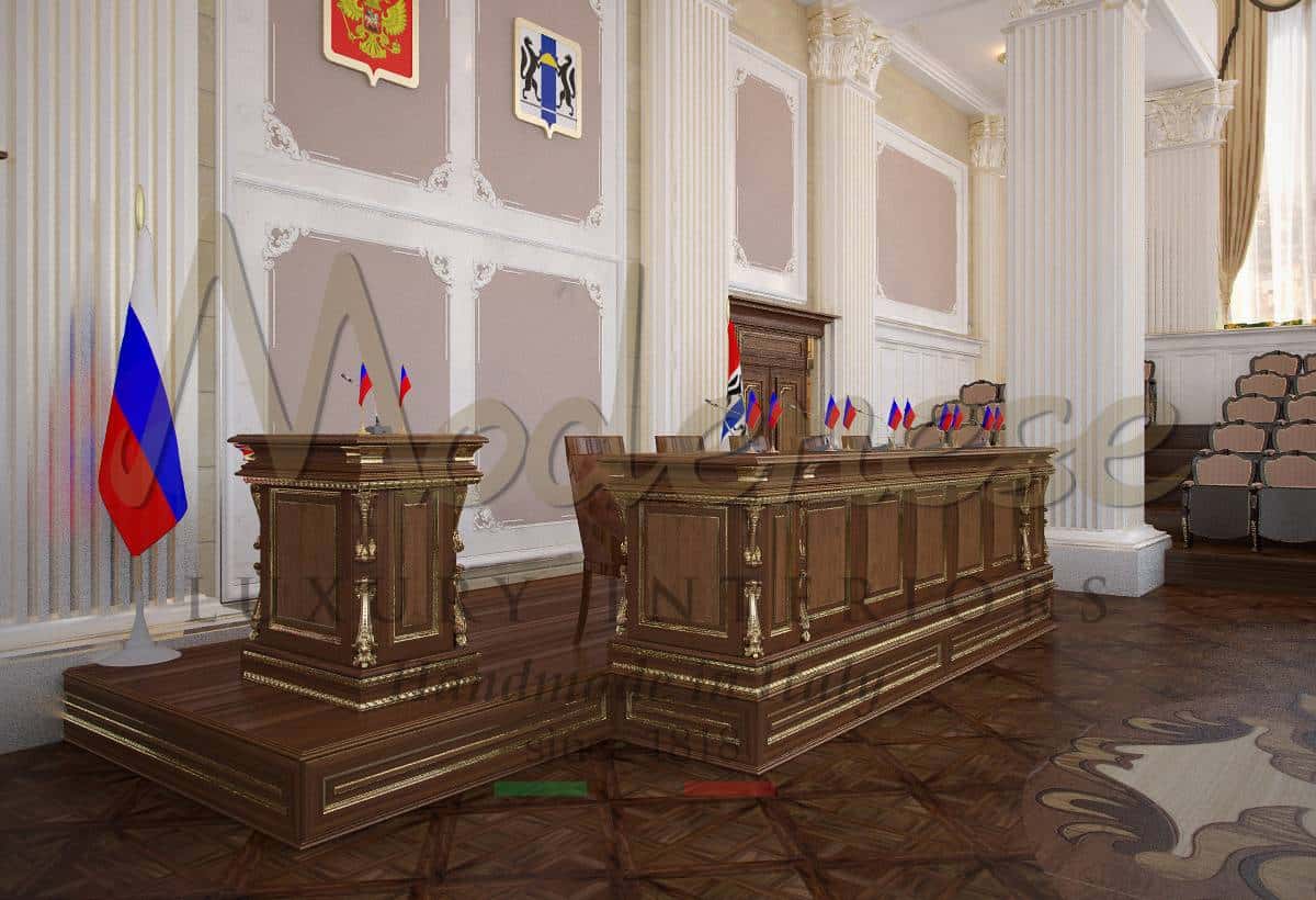 Modenese Luxury Interiors 为您打造专属而优雅的政府项目。用意大利手工制作的顶级品质和独特的法式经典风格装饰您的项目。Modenese 室内设计团队提供布局、家具布置研究和项目实施服务。宏伟而高贵的政府项目,例如世界各地的使馆和总统行政办公室项目。