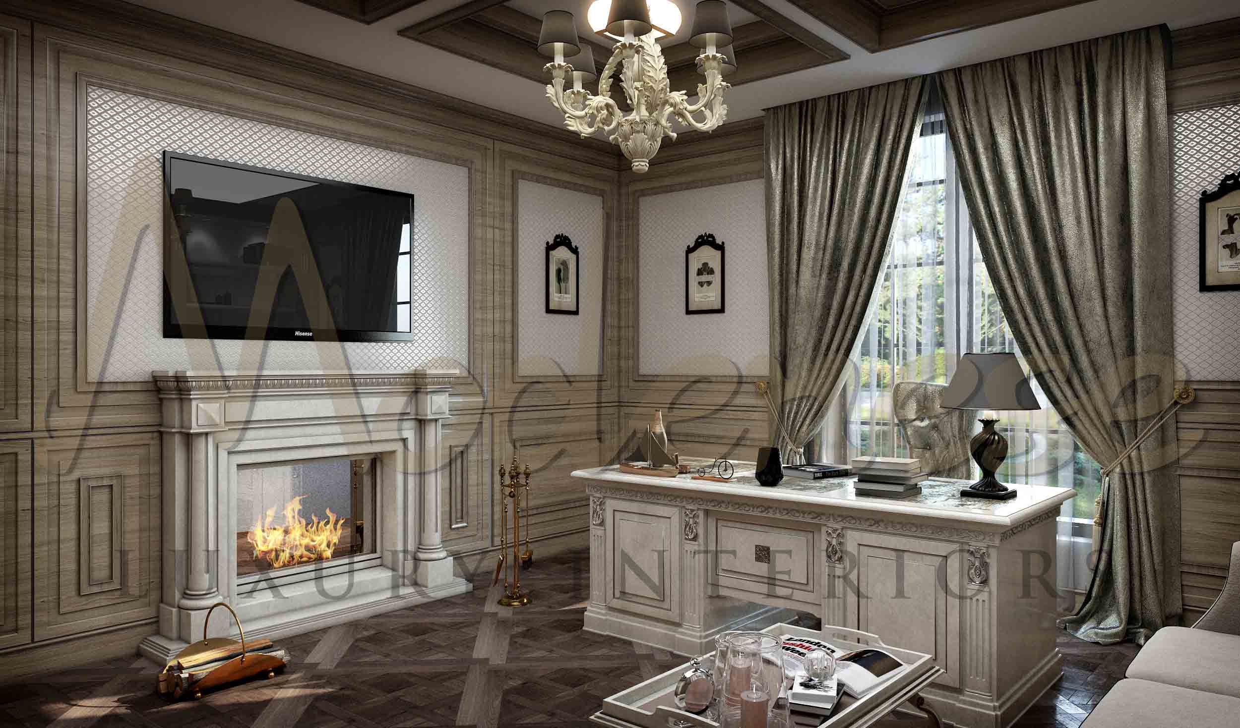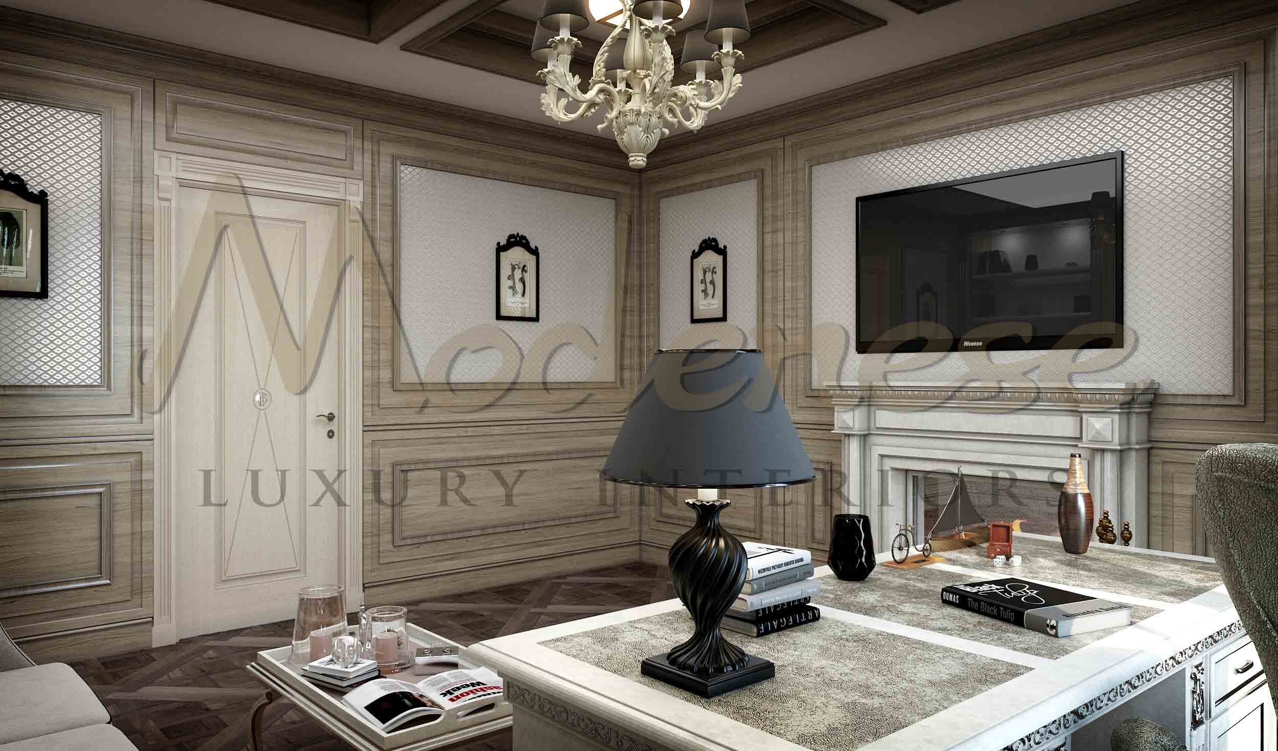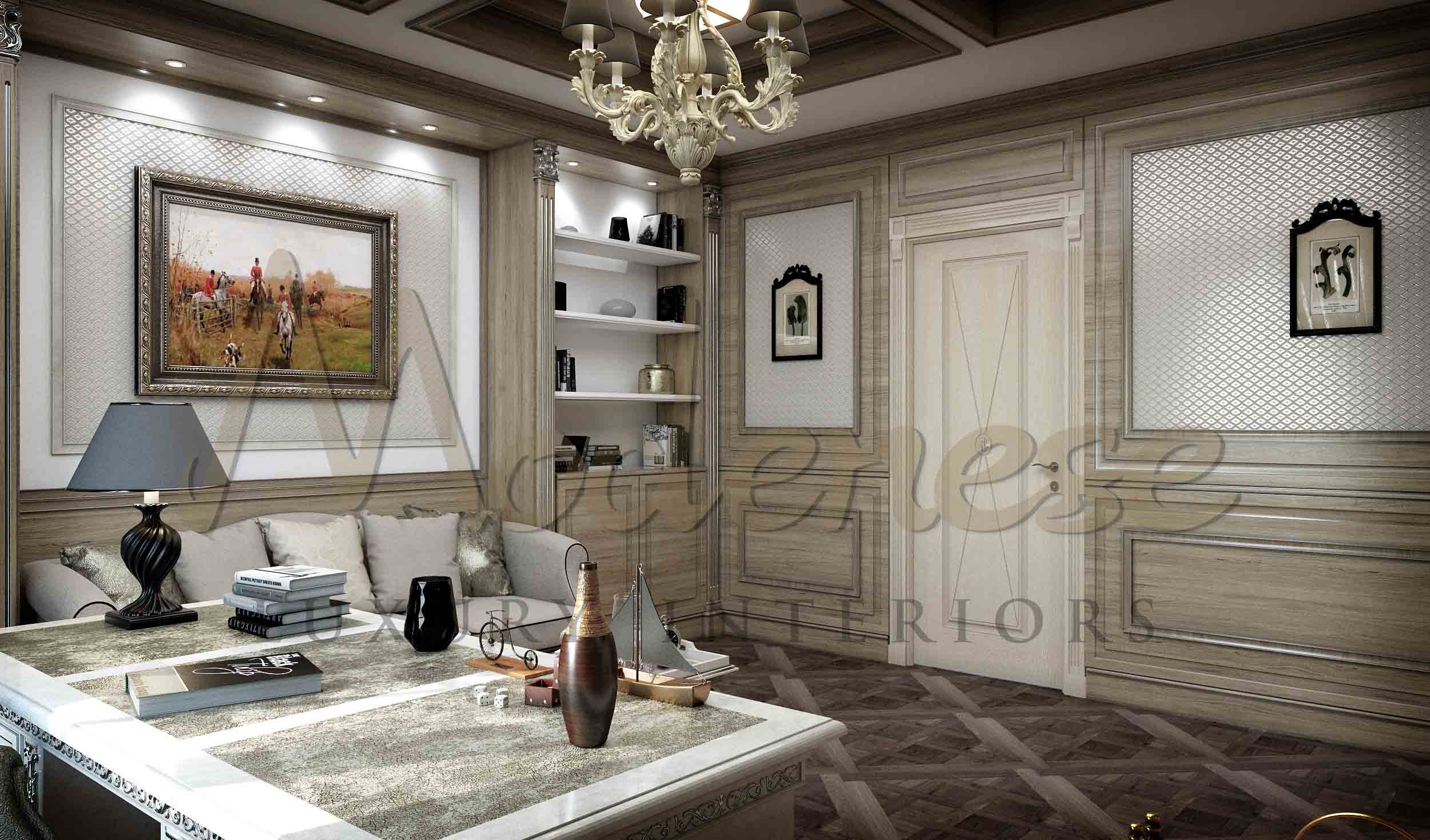 Modenese Luxury Interiors 拥有创建小屋、私人住宅或乡村别墅的奇妙室内设计所需的所有技术、创意、智力和个人资源。在创建室内设计时,我们努力使其独特、富有创意并根据居住者的品味和需求量身定制。这款时尚的办公室内部使用了高质量的材料,如人 parquet 和实木。由于墙面设计中天然木材的抛光,这款高级办公室内部外观非常吸引人且舒适。办公室空间是高效工作的高端场所,配有采用真品面料装饰的舒适家具以及优雅的墙面、天花板和地面装饰。