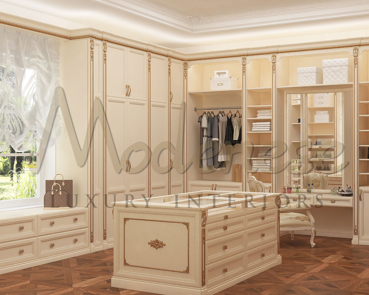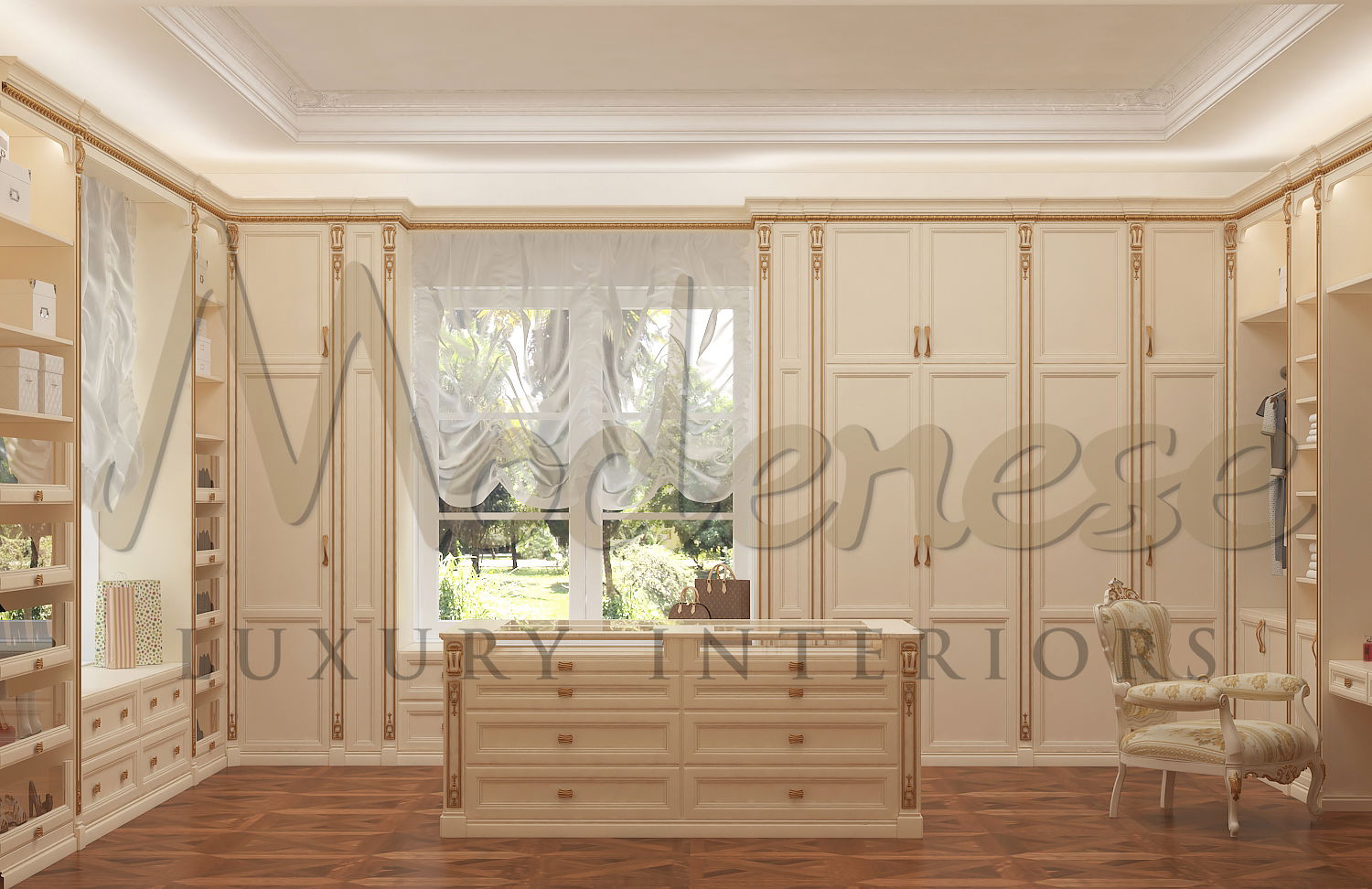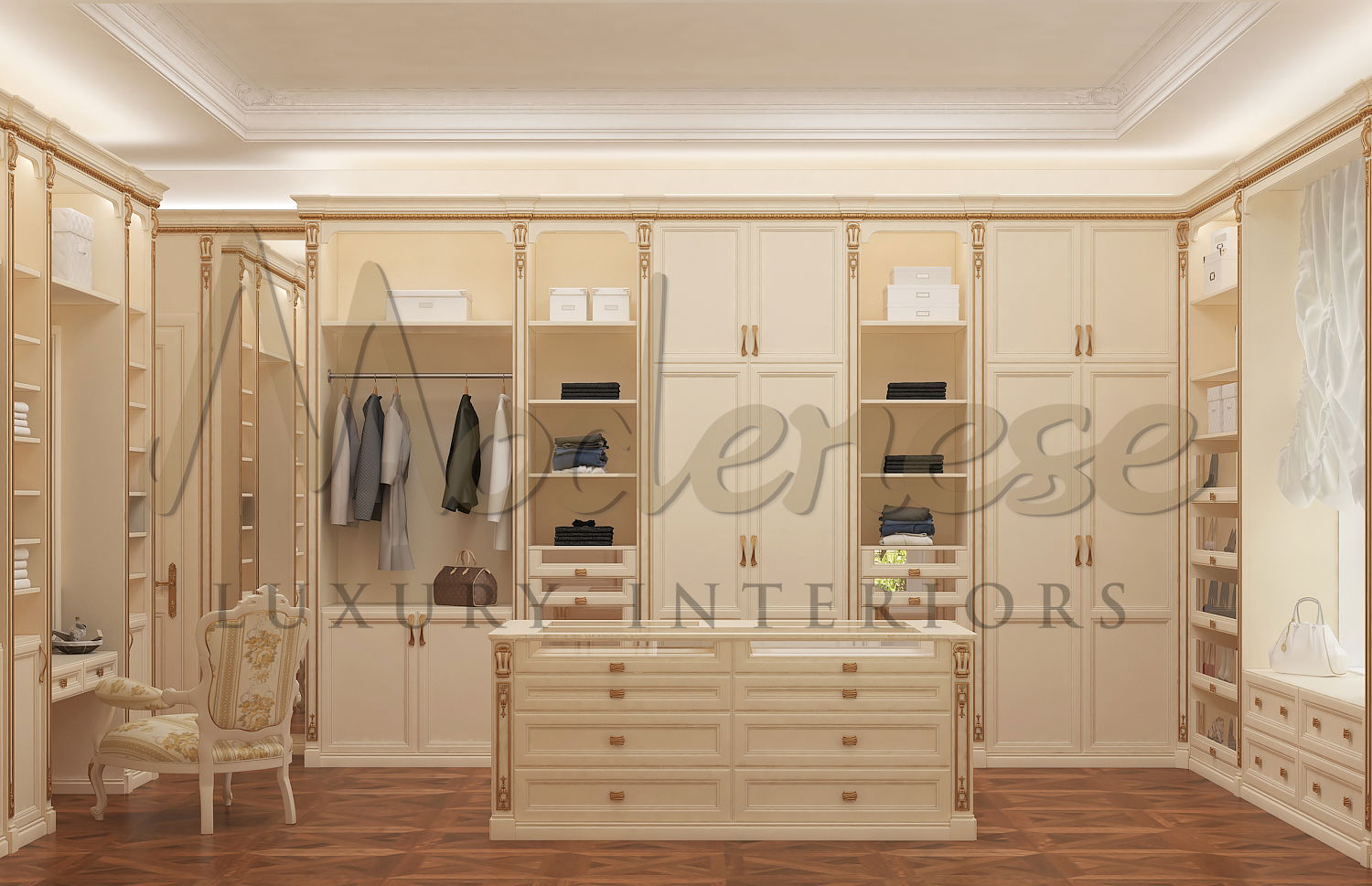 在您的衣柜中留出空间,以确保您的物品在制造过程中安全可靠。您可以在定制橱柜中使用隐藏的文件抽屉来存放重要的文件,例如遗嘱或保险单。另一种选择是安装抽屉保险箱以保护贵重物品。考虑将衬有羊毛的珠宝抽屉集成到您的衣柜橱柜中,以保持珠宝的整洁和安全。由于您将在更衣室里花费大量时间,舒适的座位在 Modenese Luxury Interiors 设计更衣室时应成为一个主要考虑因素。一张舒适的椅子、脚凳或带有隐藏存储空间的优雅长凳提供了一个很好的位置,可以穿脱衣服以及化妆。