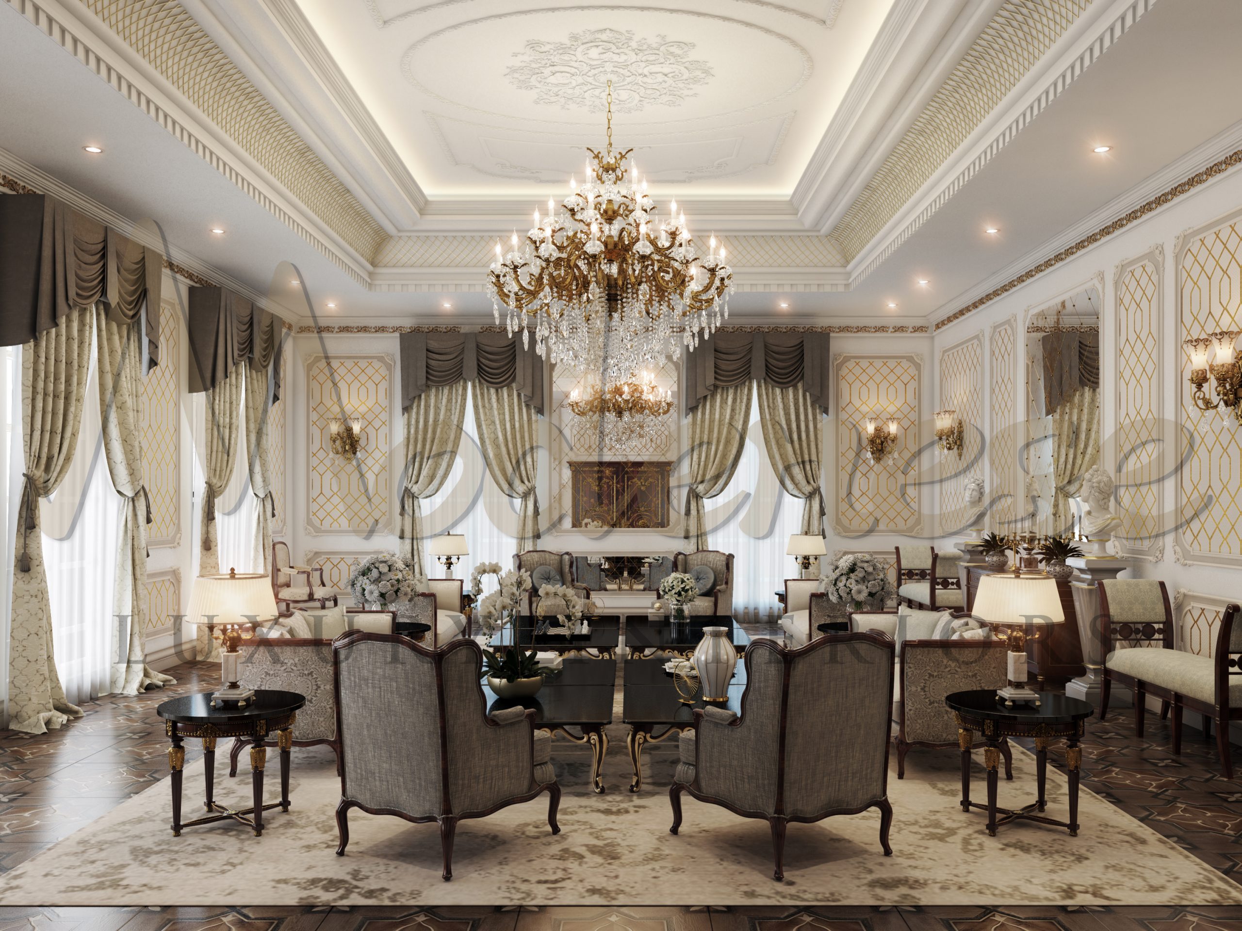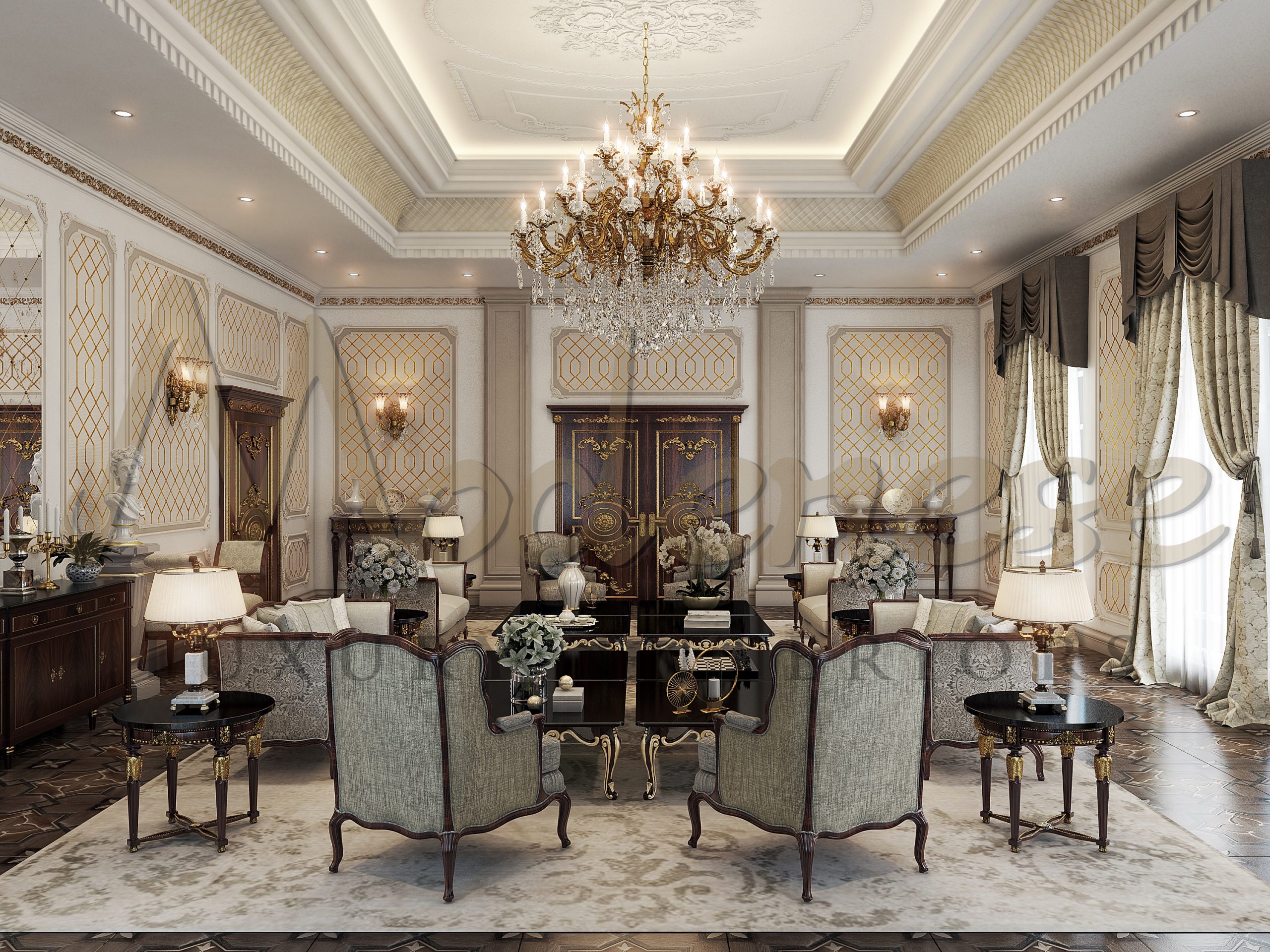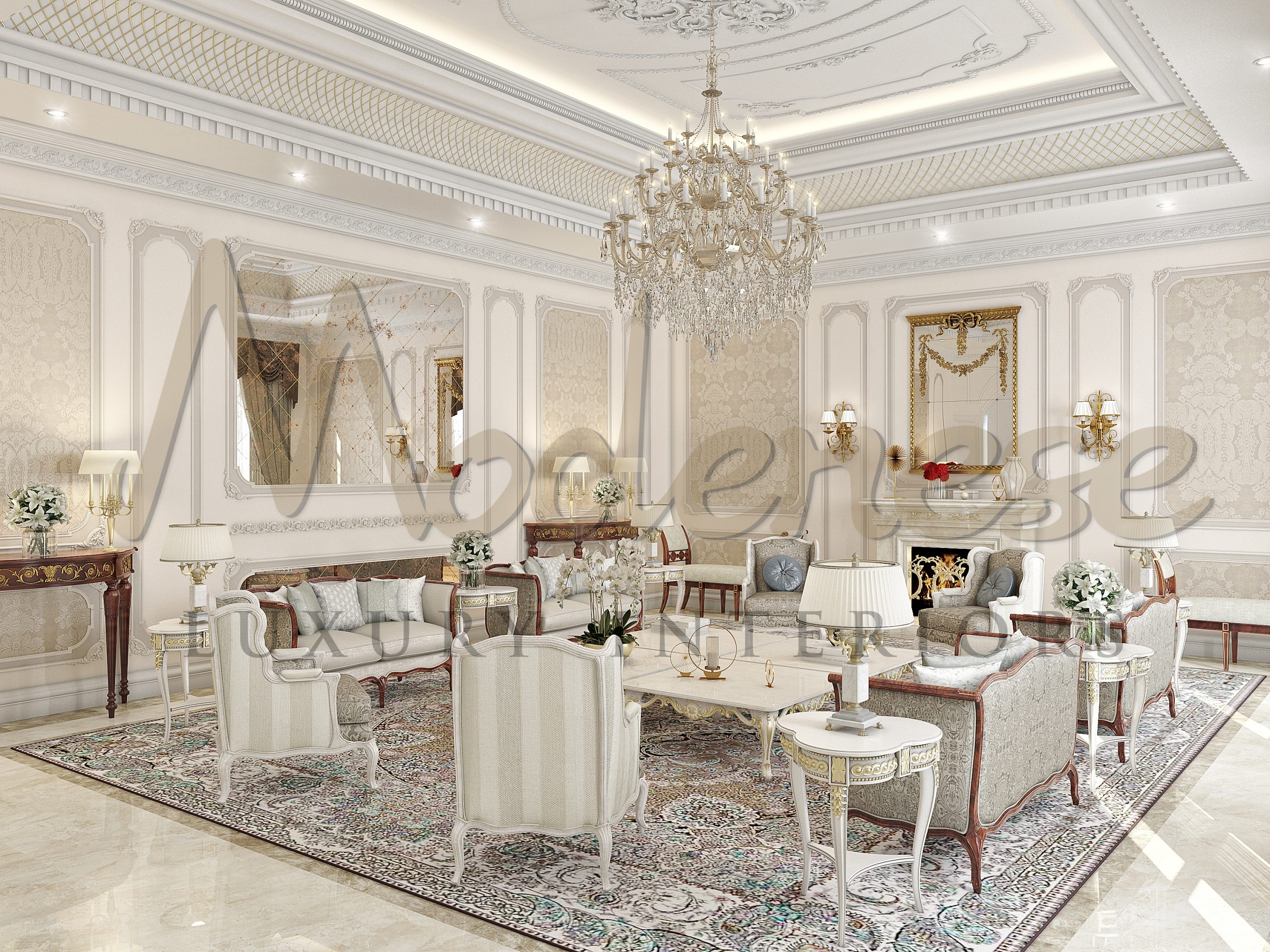 Modenese Luxury Interior`s 专业设计师使用了昂贵的材料,如木材、大理石、镀金和豪华装饰。另一个重要的认识是,颜色在客厅的经典独特室内设计中起着重要作用。金色和浅色、奶油色、棕色和米色。每种颜色都经过精心协调,以用于客厅设计。