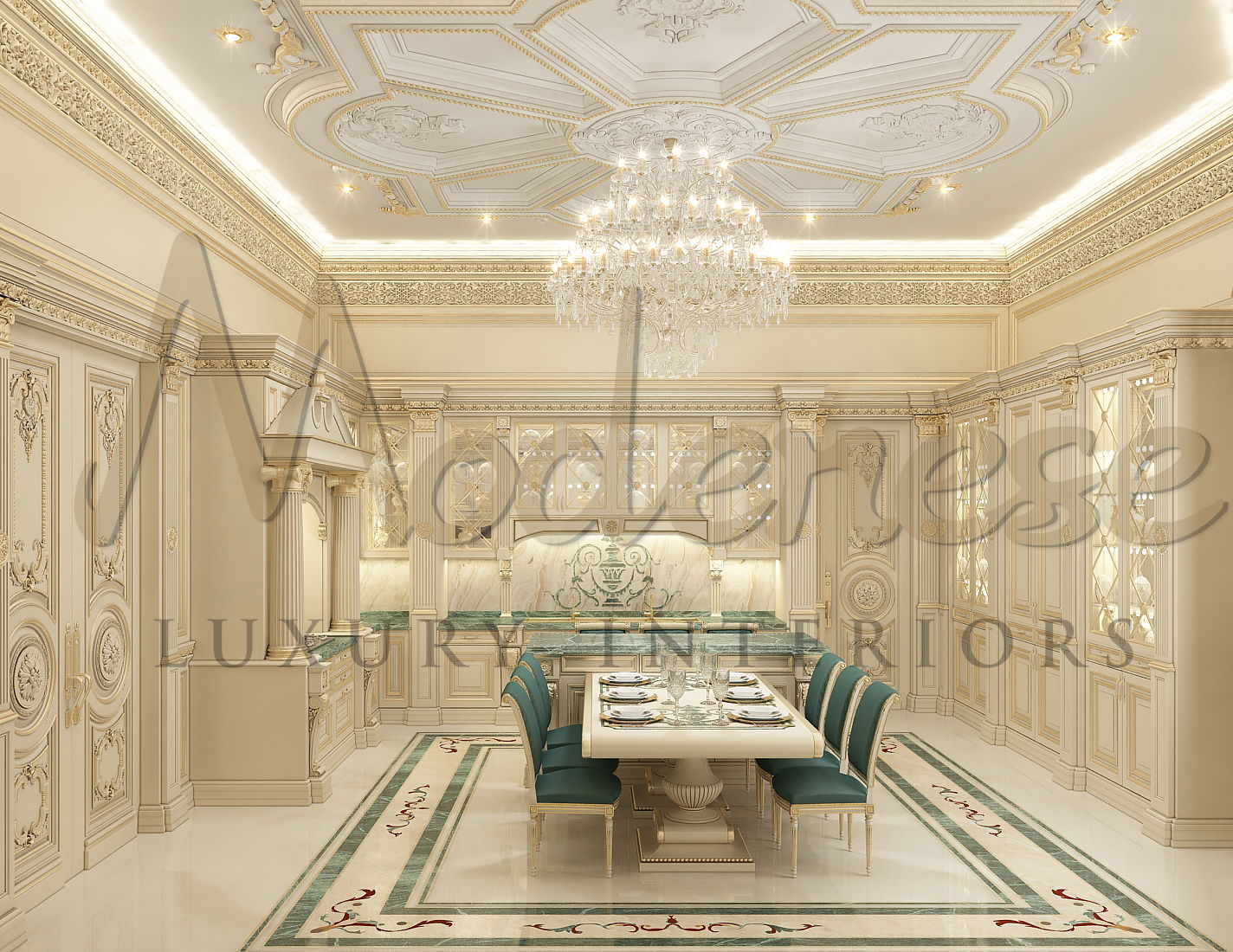经典风格和精致魅力的传统豪华厨房将吸引那些重视财富自信和精致品味的人。传统厨房的家具由木材和精美的室内装饰材料制成,带有弯曲的桌子、椅子和橱柜。饰面材料,如贴面或昂贵的可洗壁纸,带有花卉或几何图案,适合于此区域。踢脚线、面板、造型或木质镶板:木质镶板可用于装饰经典厨房的墙壁 – 这是豪华厨房的选择。这种墙面装饰将为您的厨房增添一丝贵族气息!Modenese Luxury Interiors 的经典厨房设计 – 是一个豪华的高端空间,美观和质量与精心设计的室内空间相结合。