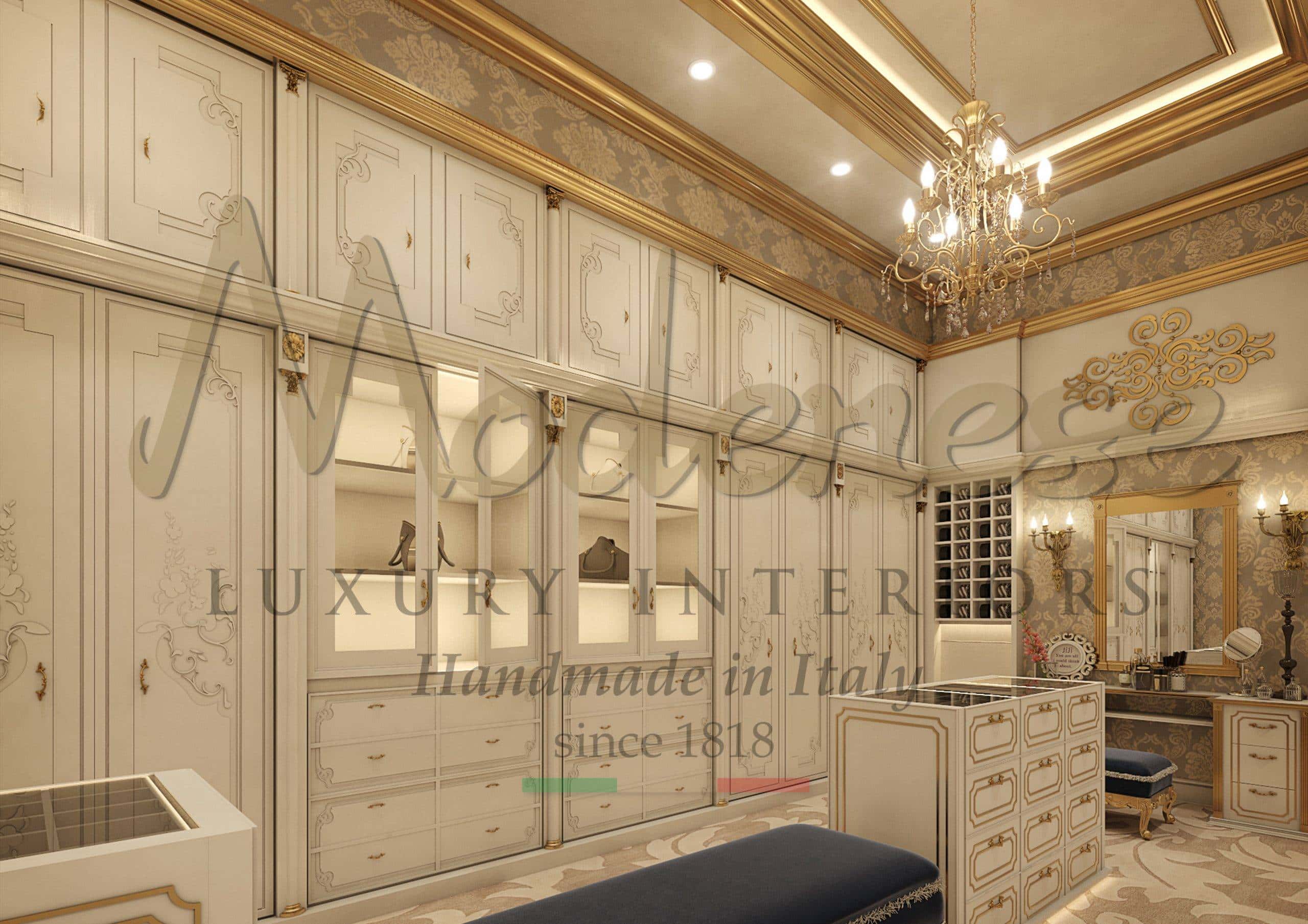 在 Modenese Luxury Interiors,每个项目都是独一无二和专属的:专为您的奢华住宅别墅设计。经典设计和为您的宏伟别墅和宫殿打造的惊人特殊细节。我们采用传统的意大利精致设计巴洛克风格,在意大利 100% 纯手工打造定制步入式衣帽间项目。